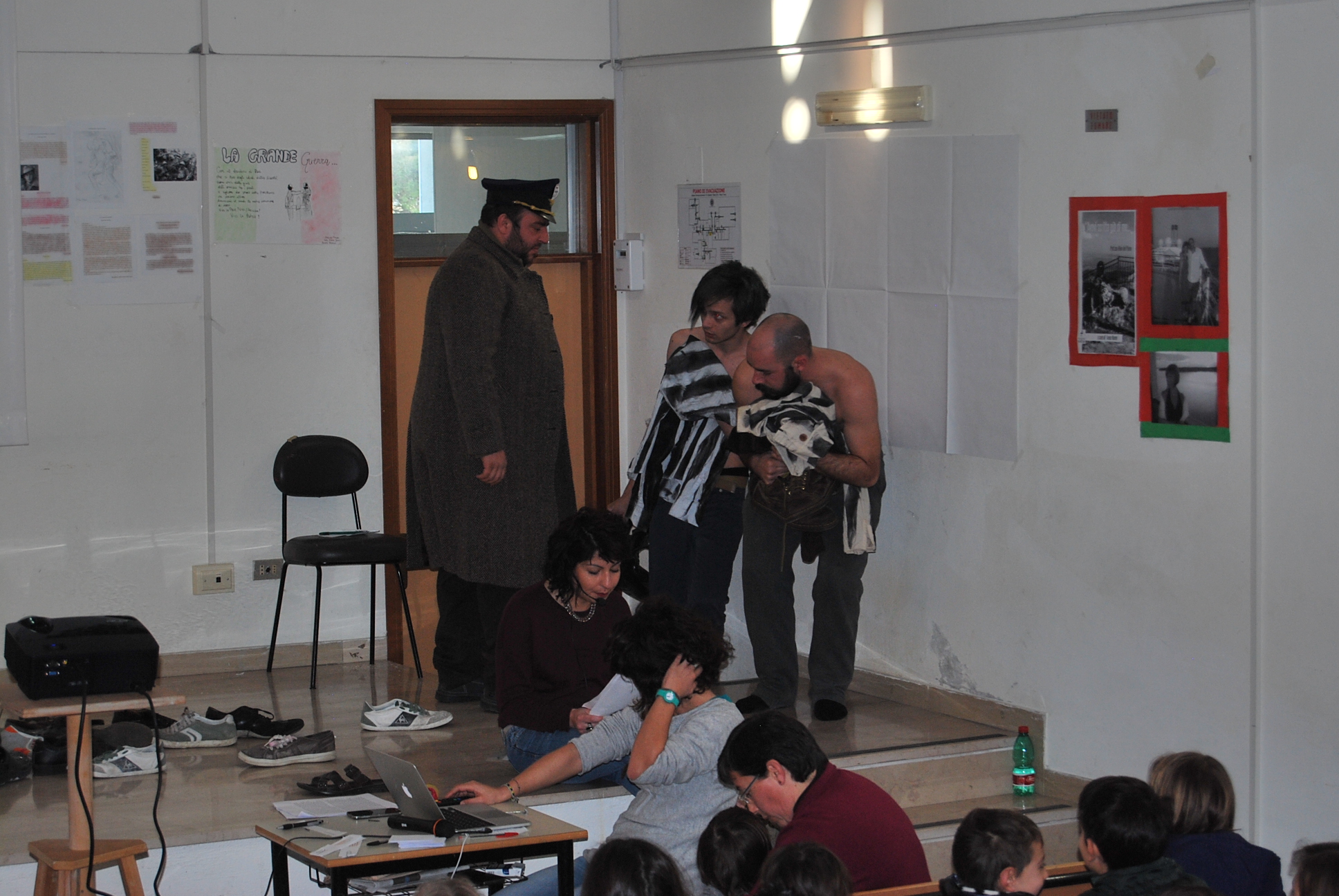 Dopo la lettura di due brani significativi, gli attori dell’Associazione Culturale Teatrale “LiberiTutti” di Gissi hanno rappresentato scene relative alla Shoah, rendendo realistici i momenti più toccanti, improvvisando la partecipazione di alcuni bambini.