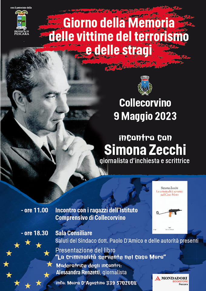 Per il Giorno della Memoria delle vittime del terrorismo e delle stragi, il Comune vestino di Collecorvino (Pe) guidato dal sindaco Paolo D’Amico ha pensato di dare la possibilità, in particolare ai più giovani, di conoscere la storia e di capire, magari ponendo le domande a chi ha molte risposte da dare soprattutto sul “caso Moro”: il 9 maggio, giorno in cui ricorre anche l’anniversario della morte dello stesso Aldo Moro, oltre che di Peppino Impastato, la giornalista d’inchiesta e scrittrice Simona Zecchi, autrice del celebre libro “La criminalità servente nel Caso Moro” edito da La nave di Teseo, incontrerà i tanti ragazzi dell’Istituto Comprensivo di Collecorvino in mattinata per dialogare con loro, mentre in serata alle ore 18.30 presso la Sala Consiliare, la Zecchi incontrerà la cittadinanza per parlare del suo libro. Modera gli appuntamenti la giornalista pescarese Alessandra Renzetti.