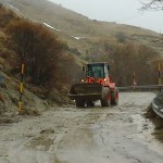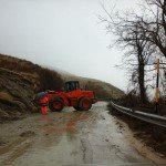 • Escavatore in azione, defluisce l’acqua del lago al di sopra della provinciale