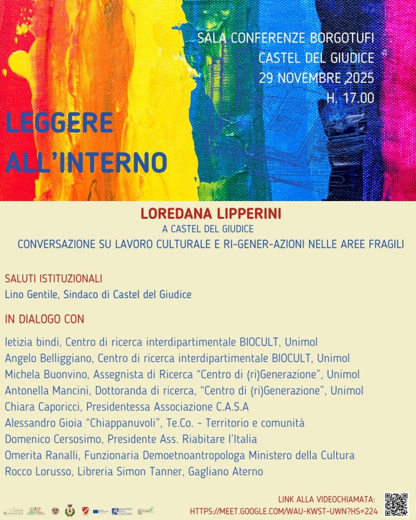 Un’occasione di confronto che si propone di analizzare le sfide e le opportunità legate al fare e al promuovere cultura nelle aree meno centrali, sottolineando come la lettura e l’attivismo culturale siano strumenti essenziali per ricostruire il senso di comunità e innescare processi di rigenerazione sostenibile: è questo l’obiettivo di “Leggere all’interno“, in programma sabato 29 novembre, alle ore 17, nella Sala meeting dell’albergo diffuso Borgotufi di Castel del Giudice. Un incontro con la conduttrice di Fahrenheit su Radio3 e oggi autrice del blog “Lipperatura”. Dopo i saluti istituzionali di Lino Gentile, seguirà un ricco dibattito che vedrà la partecipazione di esperti provenienti dal mondo accademico, della ricerca, dell’associazionismo e delle istituzioni. Tra i protagonisti Letizia Bindi, coordinatrice delle azioni immateriali del progetto, antropologa e direttrice del Centro di ricerca interdipartimentale BIOCULT dell’Università degli Studi del Molise, insieme ad Angelo Belliggiano, economista agrario e componente del Centro di ricerca interdipartimentale BIOCULT.