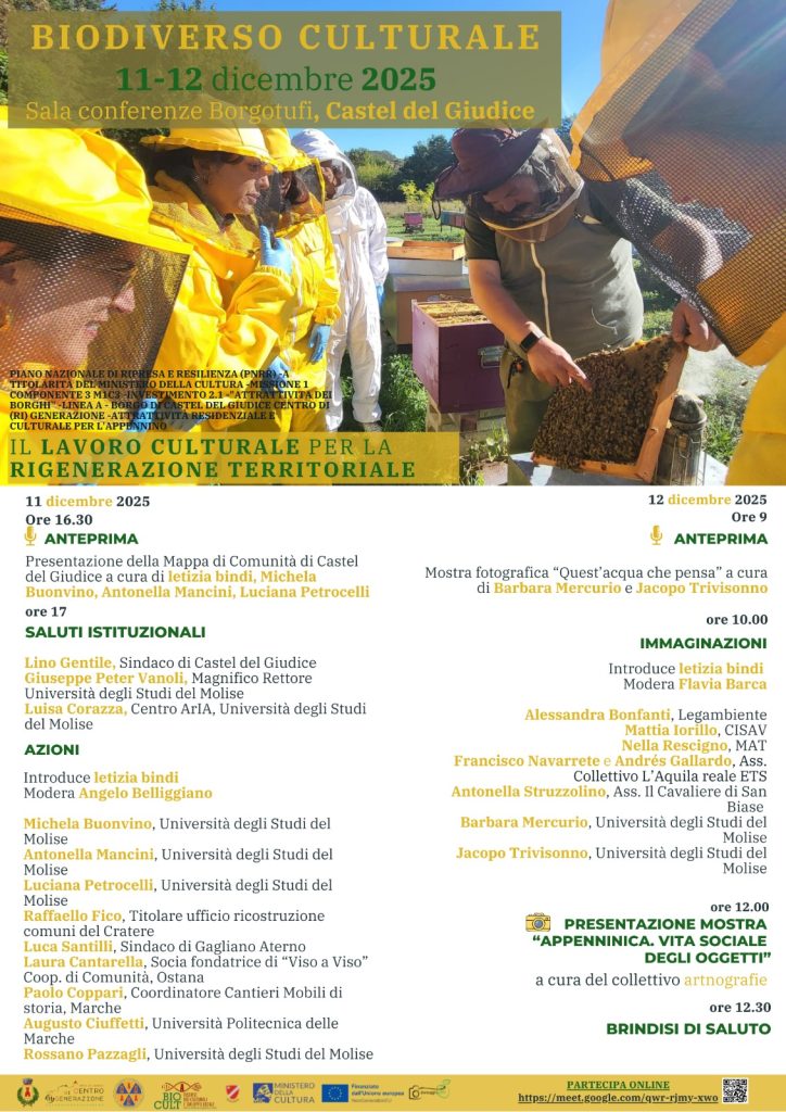 Riflettere sulle forme alternative di produzione culturale emergenti nei territori appenninici, sul potenziale culturale, creativo e professionale dei piccoli centri delle aree interne, mettendo in dialogo una pluralità di percorsi di partecipazione, cura e presa in carico dei patrimoni bioculturali: l’11 e il 12 dicembre 2025 Castel del Giudice ospiterà la terza edizione di “Biodiverso Culturale – Il lavoro culturale per la rigenerazione territoriale”, workshop dedicato al ruolo della cultura come motore di trasformazione sociale, ambientale e comunitaria nelle aree marginali, rurali e montane.