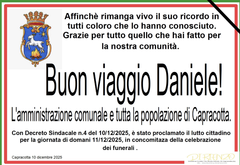 Un provvedimento, quello adottato dal sindaco, nei confronti di una persona che, spesso in silenzio, si è prodigata per il prossimo, per gli anziani e gli abitanti del paese. Aveva quarant’anni, ma la saggezza, la gentilezza e la fede di chi sembra averne vissuti molti di più. La sua scomparsa ha attraversato Capracotta come un dolore improvviso e profondo. La malattia se l’è portato via troppo presto, lasciando un vuoto immenso in una comunità che lo ha sempre amato e accolto come un figlio. Lo dimostra l’immenso via vai di gente registrato nella casa funeraria di Agnone dove Daniele Di Nucci è stato portato prima di far rientro nella sua Capracotta.
