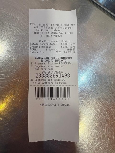 Questi i fatti. Nella serata di giovedì, presso l’impianto automatico del distributore lungo la fondovalle Sangro, appena sotto l’Alto Molise, viene effettuato un pagamento di cinquanta euro a cui però non è seguita l’erogazione di carburante. Cose che possono succedere, ma i soldi non vanno persi, perché la “macchinetta” eroga uno scontrino di credito appunto, che può essere utilizzato in un altro momento facendolo visionare al personale dell’impianto. Evidentemente l’automobilista non si è accorto dell’erogazione dello scontrino ed è andato via senza soldi e senza benzina.