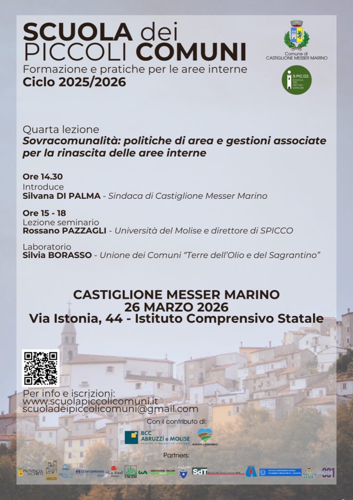 «Piccolo è fatica, piccolo è bello, ma insieme è meglio». Con queste parole il professor Rossano Pazzagli, docente dell’Unimol, aprirà oggi pomeriggio la quarta lezione della Scuola dei Piccoli Comuni che si svolge ogni mese a Castiglione Messer Marino, in provincia di Chieti, appena al di là del confine con l’Alto Molise.
