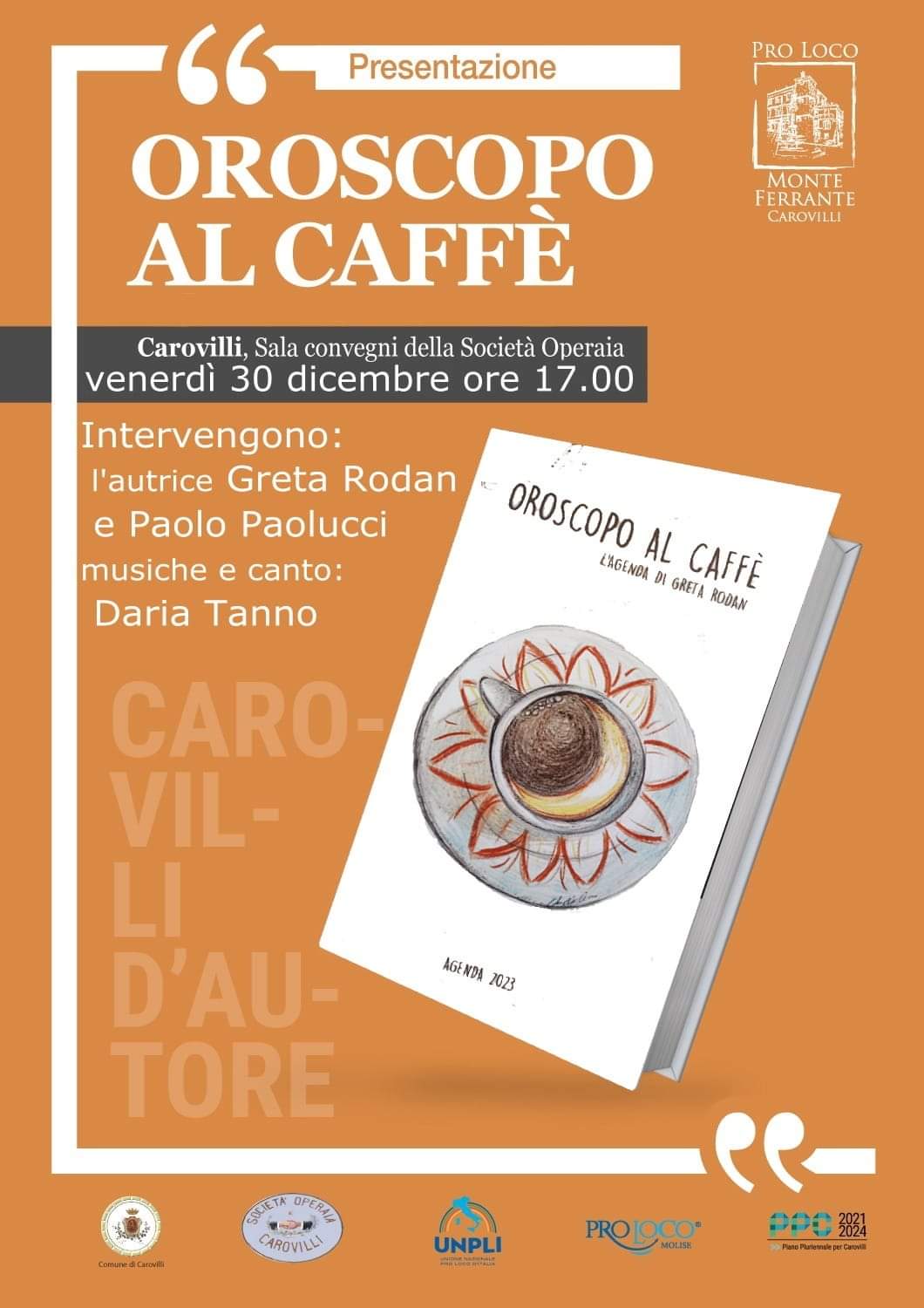 Venerdì 30 dicembre ore 17 presso la sede della Società Operaia di Carovilli, si terrà la presentazione di “Oroscopo al caffé – l’agenda di GRETA RODAN”. Nell’agenda l’autrice presenta degli originalissimi oroscopi collegandoli, in maniera simpatica, con tradizioni, piatti tipici e proverbi di tutta la penisola italiana. Il ricavato delle vendite va direttamente ad “ALI-emozioni in movimento”, un’associazione che promuove iniziative contro la violenza, in ogni sua forma. Il volume, alla sua terza edizione, è patrocinato dalla Art&Publishing, le illustrazioni sono di Valeria Vallone e la grafica di Antonio Amicone. Intervengono: l’autrice Greta Rodan e Paolo Paolucci. L’evento avrà un accompagnamento musicale curato della cantautrice Daria Tanno. I presenti potranno anche degustare una tisana durante la serata, è richiesto solo di portare da casa la propria tazza.