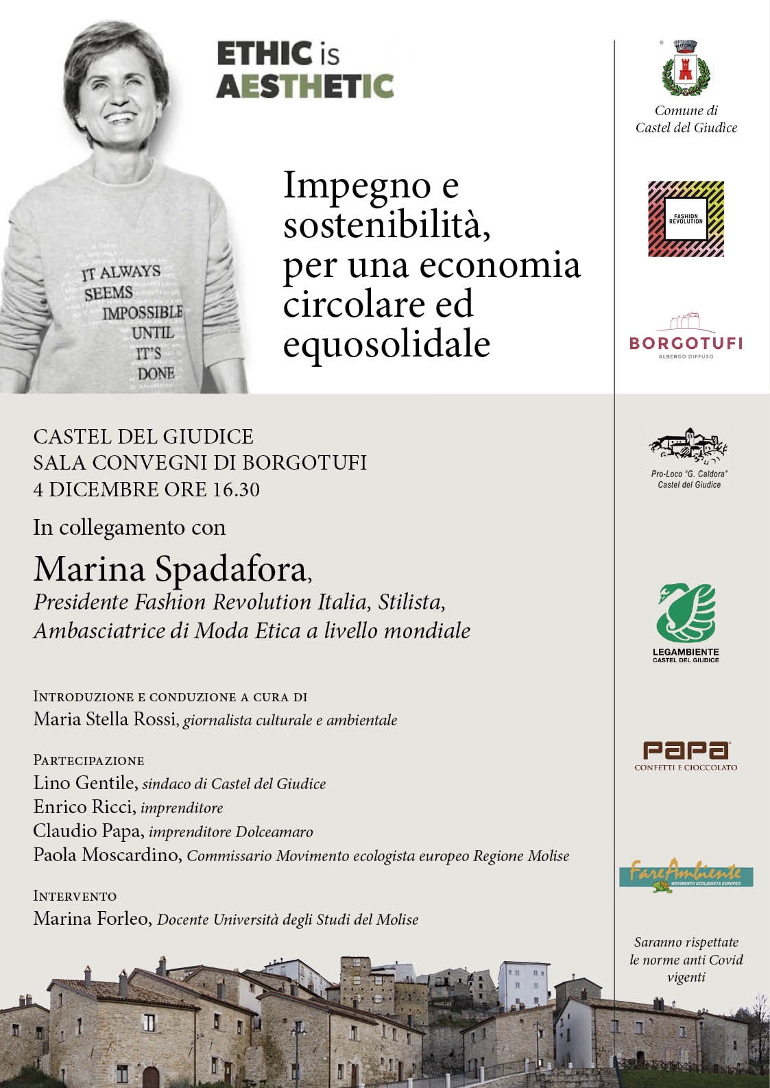 Secondo i dati raccolti, l’ esagerata produzione di abiti e accessori è diventata la seconda causa inquinante dopo il petrolio, responsabile del 10% delle emissioni di CO2, di cumuli di abiti rifiutati in discariche enormi disseminate in ogni dove, di inquinamento di mari, oceani, corsi d’acqua oltre che di metalli pesanti che la stessa pelle assorbe dagli abiti indossati. Se si pensa che ogni minuto nel Regno Unito si acquistano oltre due tonnellate di vestiti, mentre ogni settimana finiscono nelle discariche oltre undici milioni di capi, e se poi a ciò si aggiunge che ogni anno nel mondo vengono prodotti circa 150 miliardi di capi per quasi otto miliardi di persone, è lampante capire che sono tanti i miliardi di abiti che non troveranno acquirenti e che sono stati prodotti per essere distrutti, (i grandi marchi ad esempio spesso bruciano i capi invenduti). Cambiare e dare vita a nuove consapevolezze e abitudini diventa necessario e impellente e proprio Fashion Revolution, movimento internazionale di cui fa parte attiva Marina Spadafora, si batte per un cambiamento culturale sistemico perché si valorizzino le persone e il pianeta rispetto al profitto e alla crescita senza controllo. Con Marina Spadafora dialogheranno la giornalista culturale e ambientale Maria Stella Rossi, Lino Gentile, sindaco di Castel del Giudice, Enrico Ricci, imprenditore, Claudio Papa imprenditore Dolceamaro, Paola Moscardino, commissario Fare Ambiente MEE per il Molise. Sono previsti l’intervento di Marina Forleo, Docente Università degli Studi del Molise e direttrice del Comitato scientifico di Legambiente Molise, la presenza di giornalisti e di quanti desiderano conoscere e quindi condividere e diffondere le tematiche in programma. Una forte consonanza caratterizza questo incontro che avviene in un Comune, Castel del Giudice, che della sostenibilità, intesa come riuso, scelte ecologiche, attenzione all’ambiente e alle persone, ne ha fatto uno dei motivi portanti per scelte e proposte a scala locale e nazionale.