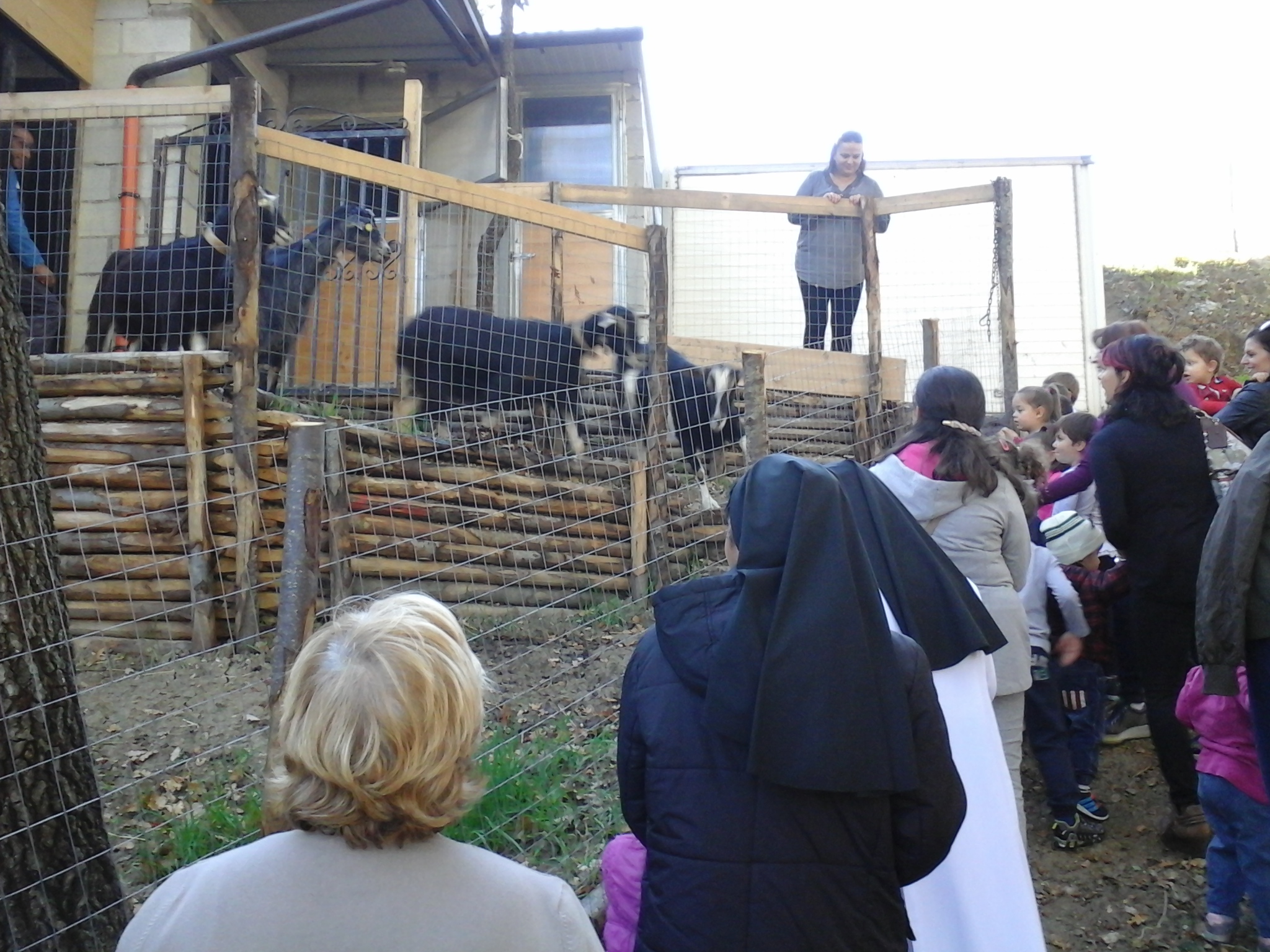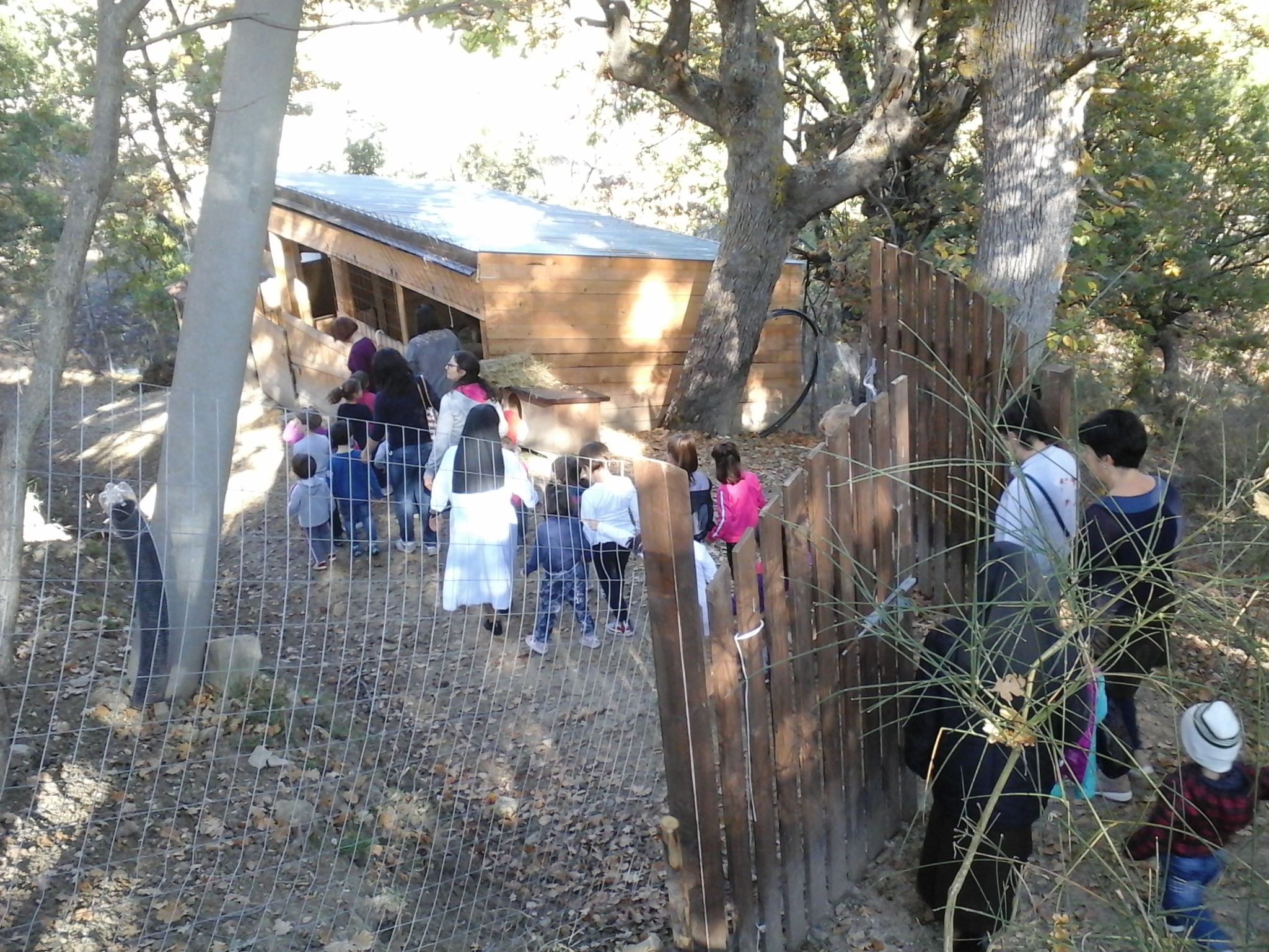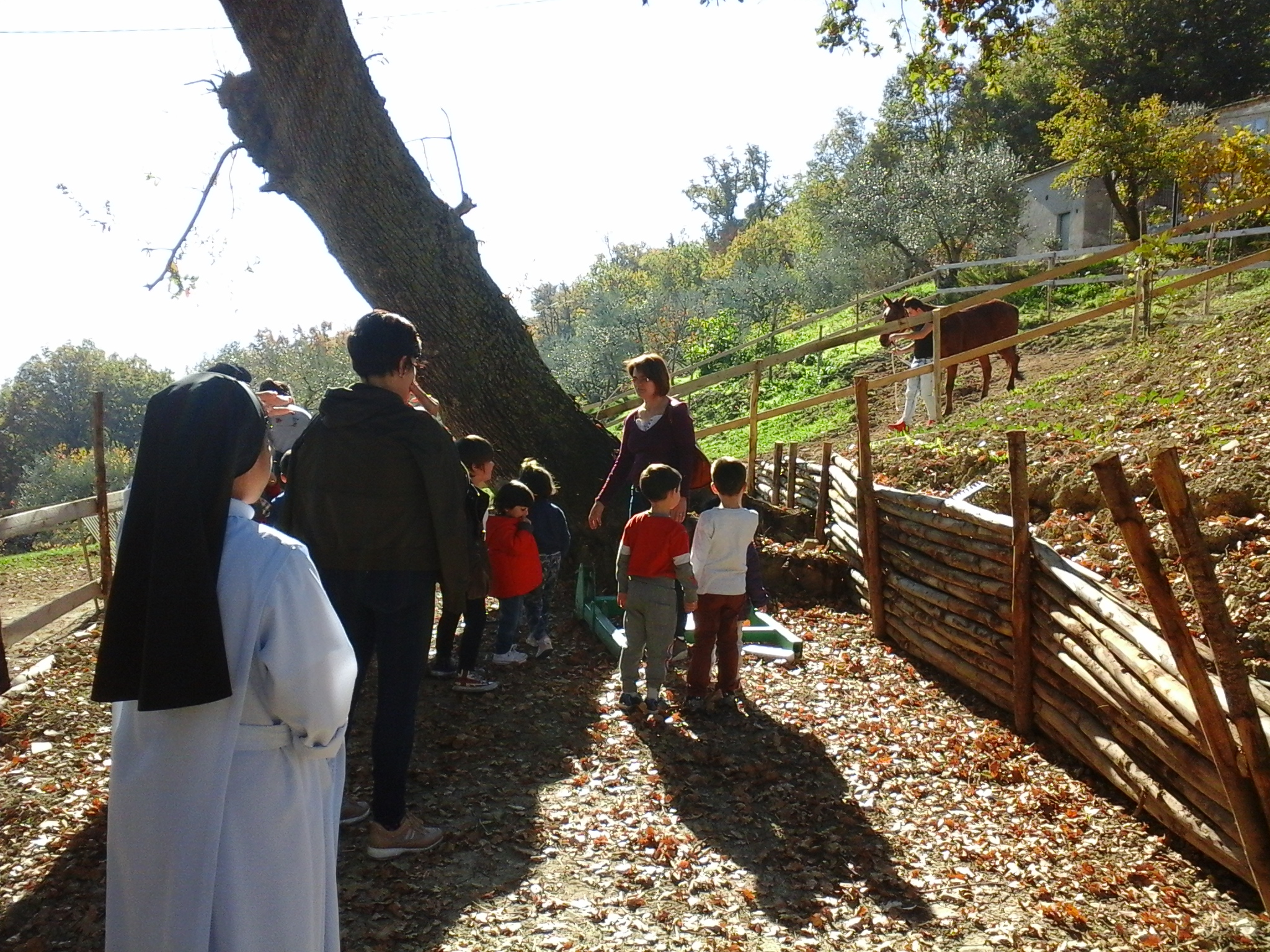 Poi l’entusiasmante visita in stalla, una vera e propria fattoria didattica. In una suggestiva ambientazione fatta di querce secolari, i piccoli alunni hanno ammirato, divertiti e incuriositi, le pecore con gli agnellini che allattavano, le capre, i maiali, ma anche le galline e i conigli, per poi approdare, felici ed emozionati, nel recinto dei cavalli. 20151113_104934