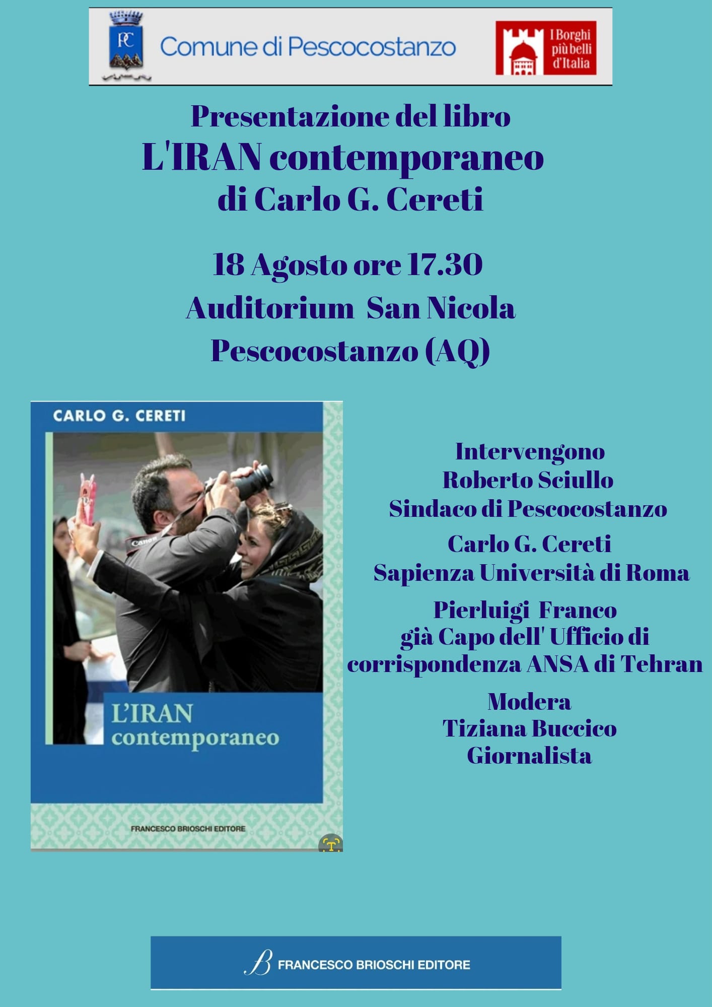 Il Comune di Pescocostanzo nell’ambito delle iniziative culturali estive, ospita, venerdì 18 agosto alle ore 17.30, nell’Auditorium San Nicola la presentazione del libro “Iran contemporaneo” di Carlo G. Cereti (Editore: Brioschi pagine: 288 p., ill., Brossura). Oltre al Sindaco Roberto Sciullo, interverrà anche il giornalista abruzzese Pierluigi Franco per raccontare della sua esperienza di inviato dell’agenzia giornalistica ANSA a Theran. L’evento sarà moderato dalla giornalista Tiziana Buccico.