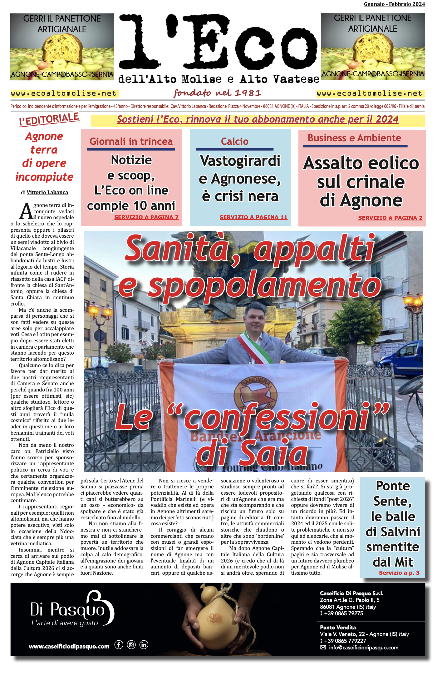 Disponibile online il nuovo numero (febbraio - marzo 2024) del mensile l'Eco de l'Alto Molise - Vastese. La versione cartacea acquistabile nelle edicole di Agnone e Castiglione Messer Marino. Sostieni la stampa libera, compra una copia de l'Eco,…