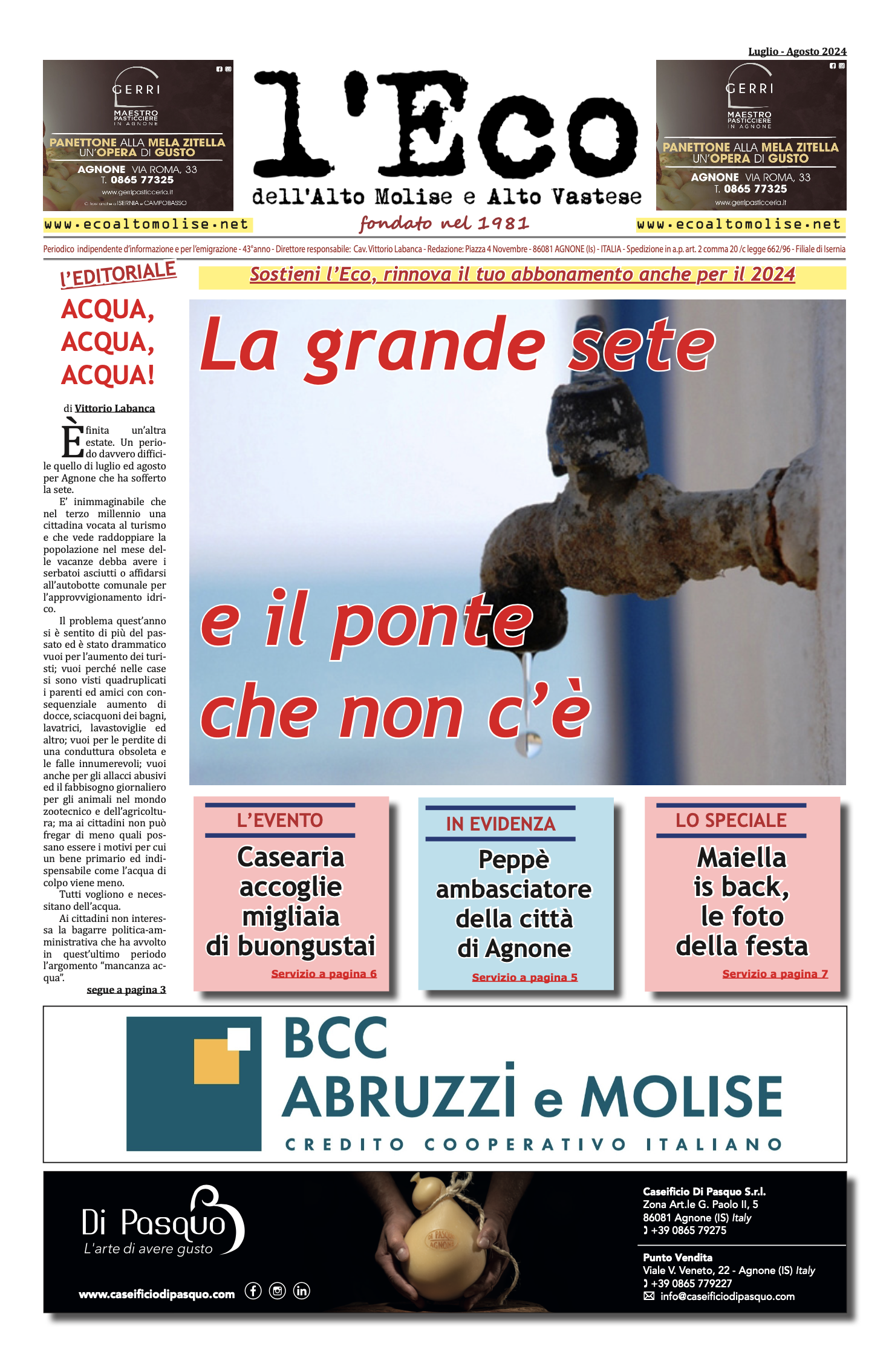 Disponibile online il nuovo numero (agosto - settembre 2024) del mensile l'Eco de l'Alto Molise - Vastese. La versione cartacea acquistabile nelle edicole di Agnone e Castiglione Messer Marino. Sostieni la stampa libera, compra una copia de l'Eco,…