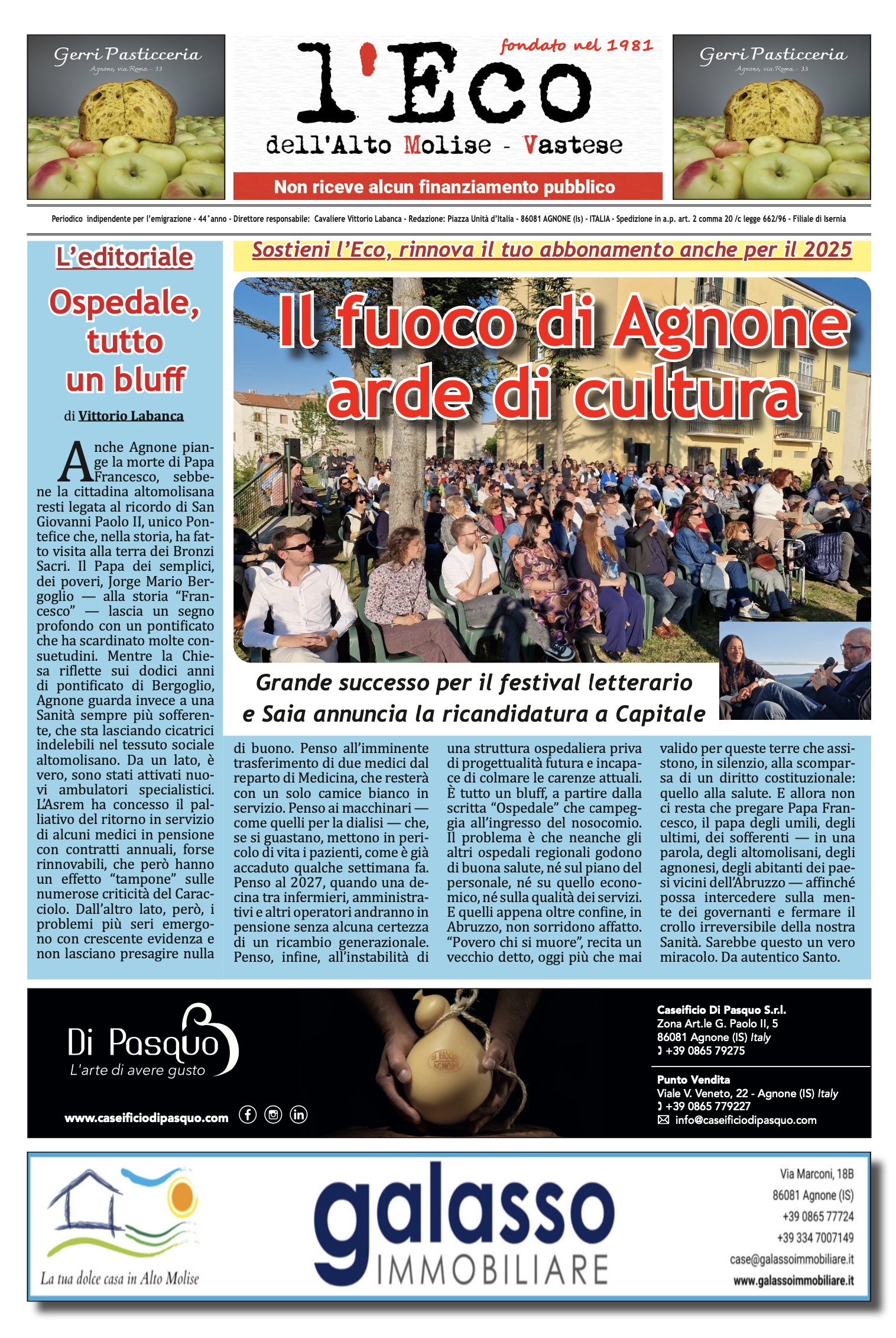 Disponibile online il nuovo numero (febbraio - marzo 2025) del mensile l'Eco de l'Alto Molise - Vastese. La versione cartacea acquistabile nelle edicole di Agnone e Castiglione Messer Marino. Sostieni la stampa libera, compra una copia de l'Eco,…