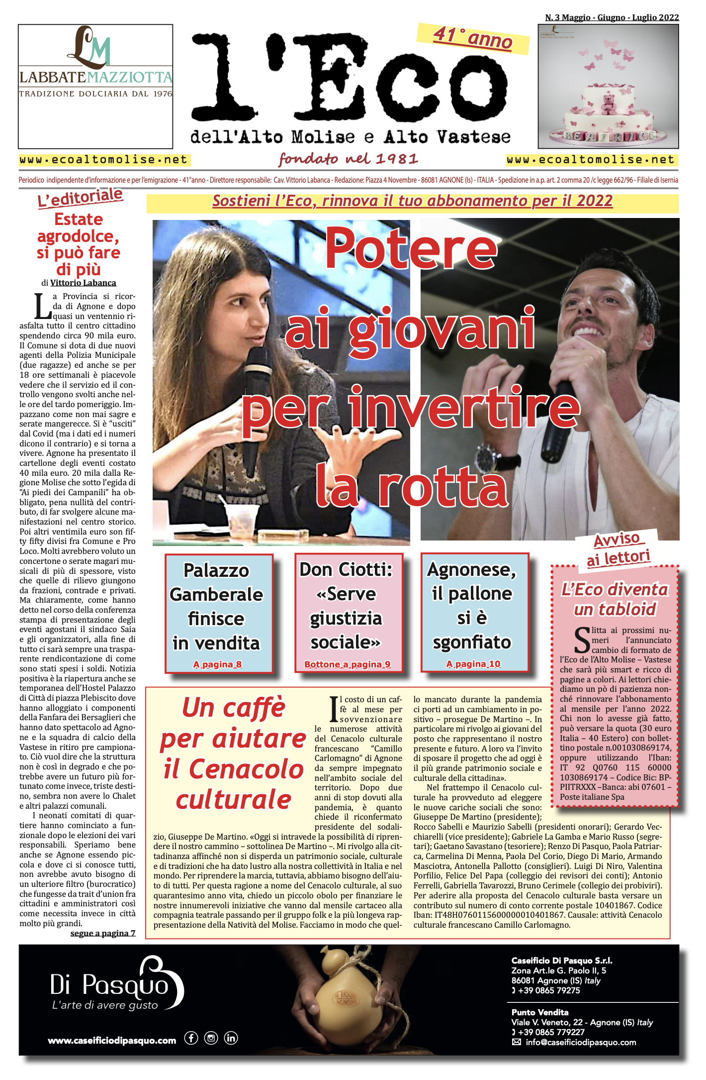 Disponibile online il nuovo numero (luglio - agosto 2022) del mensile l'Eco de l'Alto Molise - Vastese. La versione cartacea acquistabile nelle edicole di Agnone e Castiglione Messer Marino. Sostieni la stampa libera, compra una copia de l'Eco,…