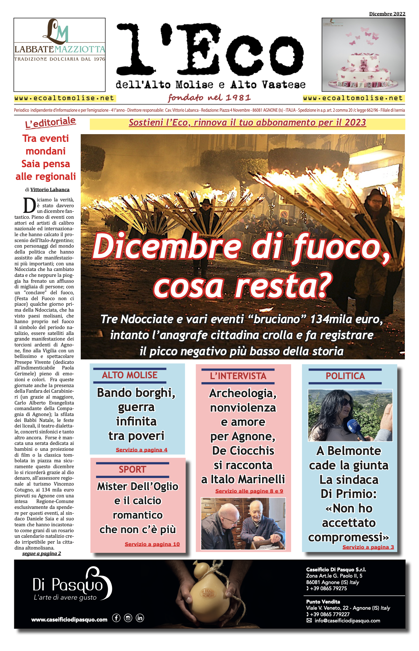 Disponibile online il nuovo numero (novembre - dicembre 2022) del mensile l'Eco de l'Alto Molise - Vastese. La versione cartacea acquistabile nelle edicole di Agnone e Castiglione Messer Marino. Sostieni la stampa libera, compra una copia de l'Eco,…