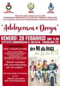 tra la Commissione Cultura e Formazione del Comune di Frosolone e la Dirigenza Scolastica». Ne dà notizia il sindaco di Frosolone, Felice Ianiro. Si tratta di una iniziativa promossa con il patrocinio dei vicini Comuni di Civitanova del Sannio e Macchiagodena. “Adolescenza e droga“, questo il titolo del convegno che vedrà la partecipazione del professor Giuseppe Di Iorio, ordinario di Neurologia, già direttore della scuola di specializzazione in Neurologia dell’Università della Campania “Luigi Vanvitelli“. Il docente universitario tratterà il tema degli “Aspetti neurologici delle tossicodipendenze nell’età evolutiva”. L’altro relatore è la psicologa Maria Ottaviano che tratterà il tema degli “Aspetti psicologici delle tossicodipendenze”.