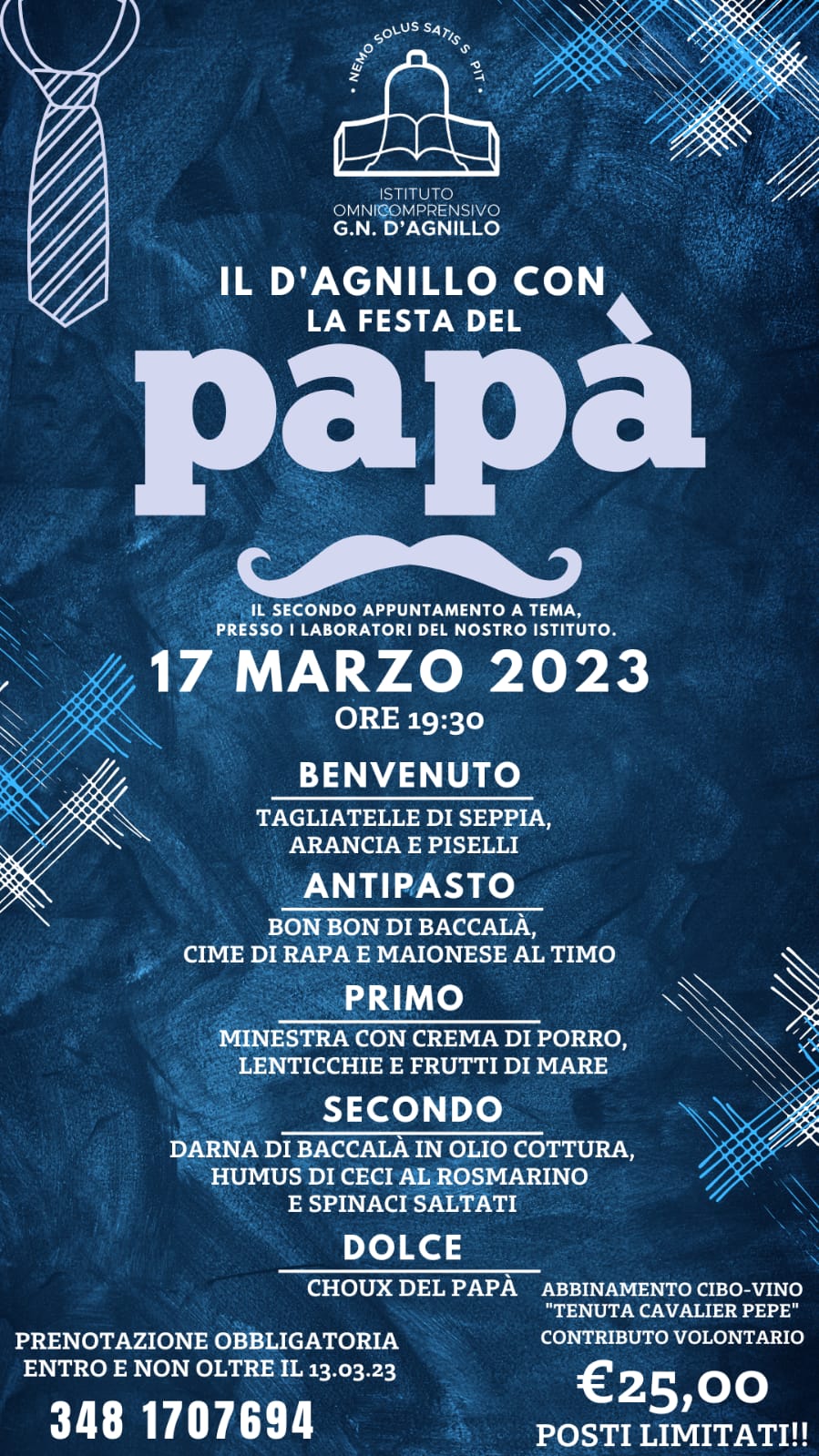Secondo appuntamento con il ‘Ristorante didattico’ promosso da docenti e studenti dell’istituto Alberghiero ‘San Francesco Caracciolo’ di Agnone. Questa volta il tema della serata di gala è la festa del papà che si terrà venerdì 17 marzo (19,30) nella sala ricevimento dell’Itis ‘Leonida Marinelli’. Ricco il menù della cena che prevede il benvenuto con tagliatelle di seppia, arancia e piselli; l’antipasto con un bon bon di baccalà, cime di rapa e maionese al timo; un primo di minestra con crema di porro, lenticchie e frutti di mare; il secondo darna di baccalà in olo cottura, humus di ceci al rosmarino e spinaci saltati. Dulcis in fundo dolce di choux del papà. Le prenotazioni sono aperte entro e non oltre l 13 febbraio.