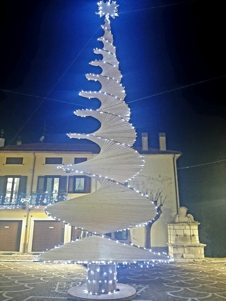 Il “Paese degli abeti” non usa un abete per fare l’albero di Natale. Il paradosso solo apparente, che in realtà è una lezione ambientalista e di coerenza per tutti, arriva da Pescopennataro. Nelle ultime ore la piazza principale del piccolo borgo dell’Alto Molise è stata addobbata con una installazione artistica, tutta in legno, quindi eco friendly; una spirale che sale verso il cielo e l’Infinito, che sostituisce appunto il solito albero di Natale.