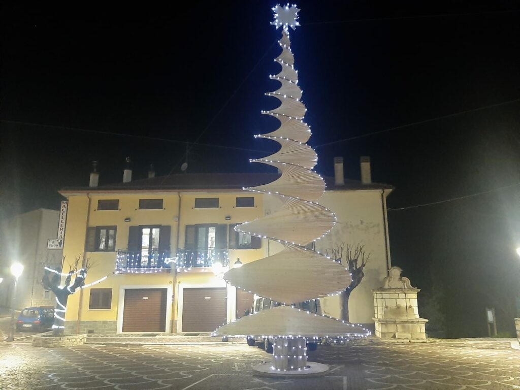 «Noi siamo il paese degli abeti, – aggiunge Carfagna – ma recidere un albero per utilizzarlo qualche giorno appena non avrebbe avuto molto senso, soprattutto perché non avevamo disponibili piante che derivassero da operazioni di disboscamento necessarie per mantenere il bosco in salute. Tra l’altro i tempi e soprattutto i costi per sradicare un albero e poi ripiantumarlo non erano sostenibili. Abbiamo optato per quella che secondo noi è la scelta più green, perché l’albero installato è completamente in legno, è riutilizzabile potenzialmente all’infinito se conservato bene e quando non sarà più utilizzabile è completamente biodegradabile. Ci è sembrata la soluzione migliore, anche da punto di vista dell’impatto ambientale. Devo ringraziare Antonio Cenci, Sabatino Forgione, Giacinto Carfagna e Giuseppe Bellisario che si sono messi completamente a disposizione per la realizzazione di un albero di Natale che va incontro alla nostra idea di sostenibilità ambientale».