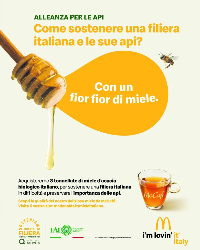 Cuore dell’iniziativa è un accordo di fornitura annuale che prevede l’impiego di 8 tonnellate di miele di acacia biologico italiano, pari a circa 2 milioni di bustine, all’interno della rete di vendita di McDonald’s, accompagnato da una campagna di comunicazione dedicata all’importanza delle api e alla qualità del miele italiano.