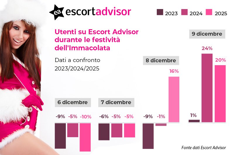 Partiamo dal weekend dell’Immacolata, l’8 dicembre, che quest’anno cadeva di lunedì, ha registrato un importante aumento del traffico sul sito con un +20% rispetto al giorno precedente. Sia il 2024 che il 2023 registravano invece rispettivamente –1% e –9%. Il dato conferma che la giornata di lunedì, anche se festiva, risulta il momento della settimana più movimentata per chi cerca la compagnia di una escort. Il picco positivo si è prolungato quest’anno anche al martedì 9 dicembre con un +20% (nel 2024 era +24% perchè cadeva di lunedi, mentre nel 2023 ricerche quasi azzerate), un inusuale martedì hot per chi ha fatto ponte e ha quindi recuperato l’incontro con una escort.