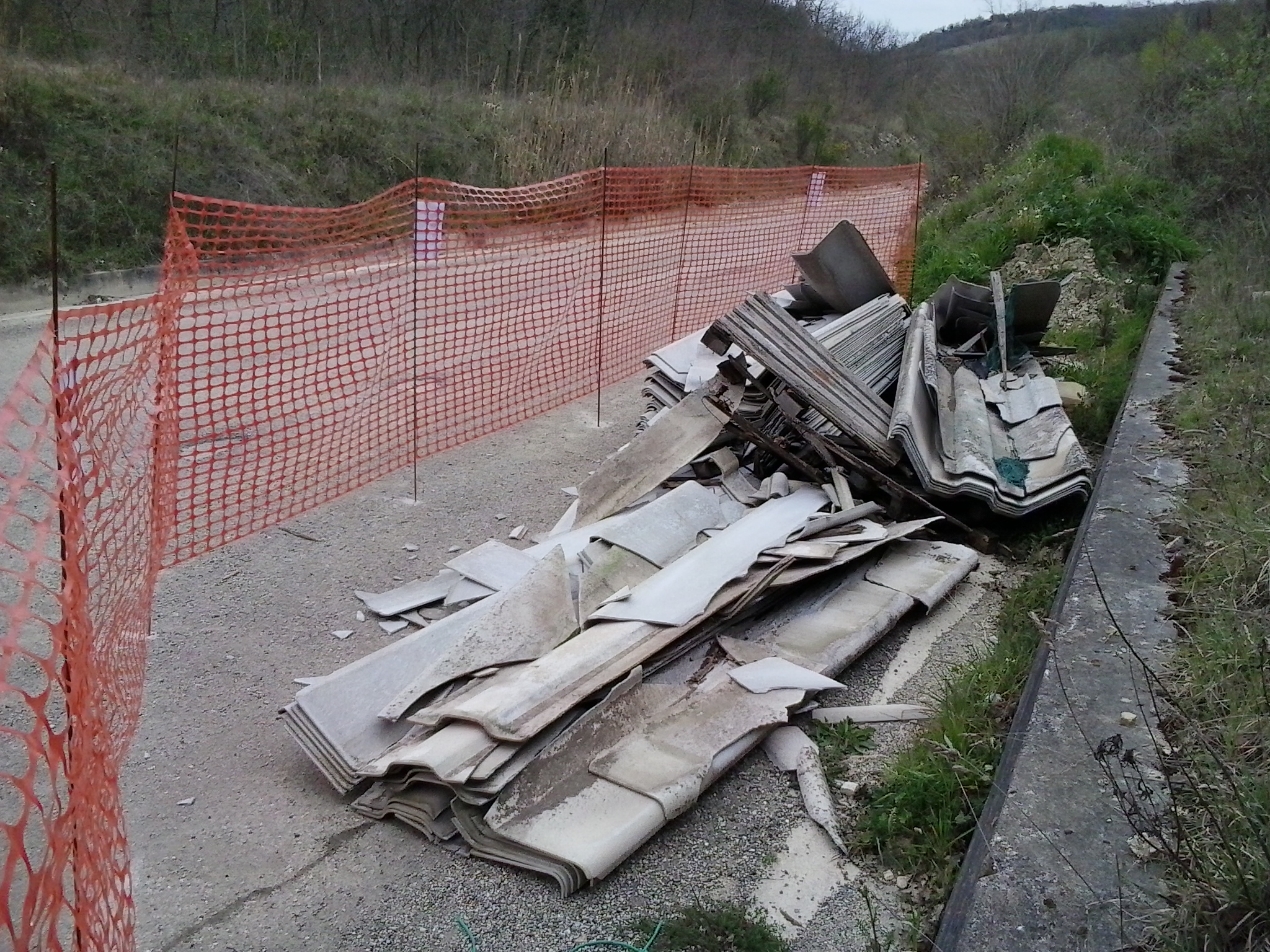 Come si ricorderà, lo scorso 20 marzo, ignoti, approfittando con ogni probabilità dell’oscurità e dell’abbandono di quei luoghi, hanno utilizzato uno spazio pubblico per lasciare sul posto ciò che sicuramente non avrebbero accantonato sulla loro proprietà, numerose lastre di eternit che come risaputo, rilasciano in stato di degrado, come in questa circostanza, amianto, elemento non riciclabile ed altamente nocivo per la salute. Il tratto di strada utilizzato a stregua di discarica, risulta appetibile in quanto, dopo una prima fase di lavori per la realizzazione dell’indispensabile arteria, ne è seguita un’ altra di totale abbandono così da essere  “favorita”  da soggetti non proprio civili.