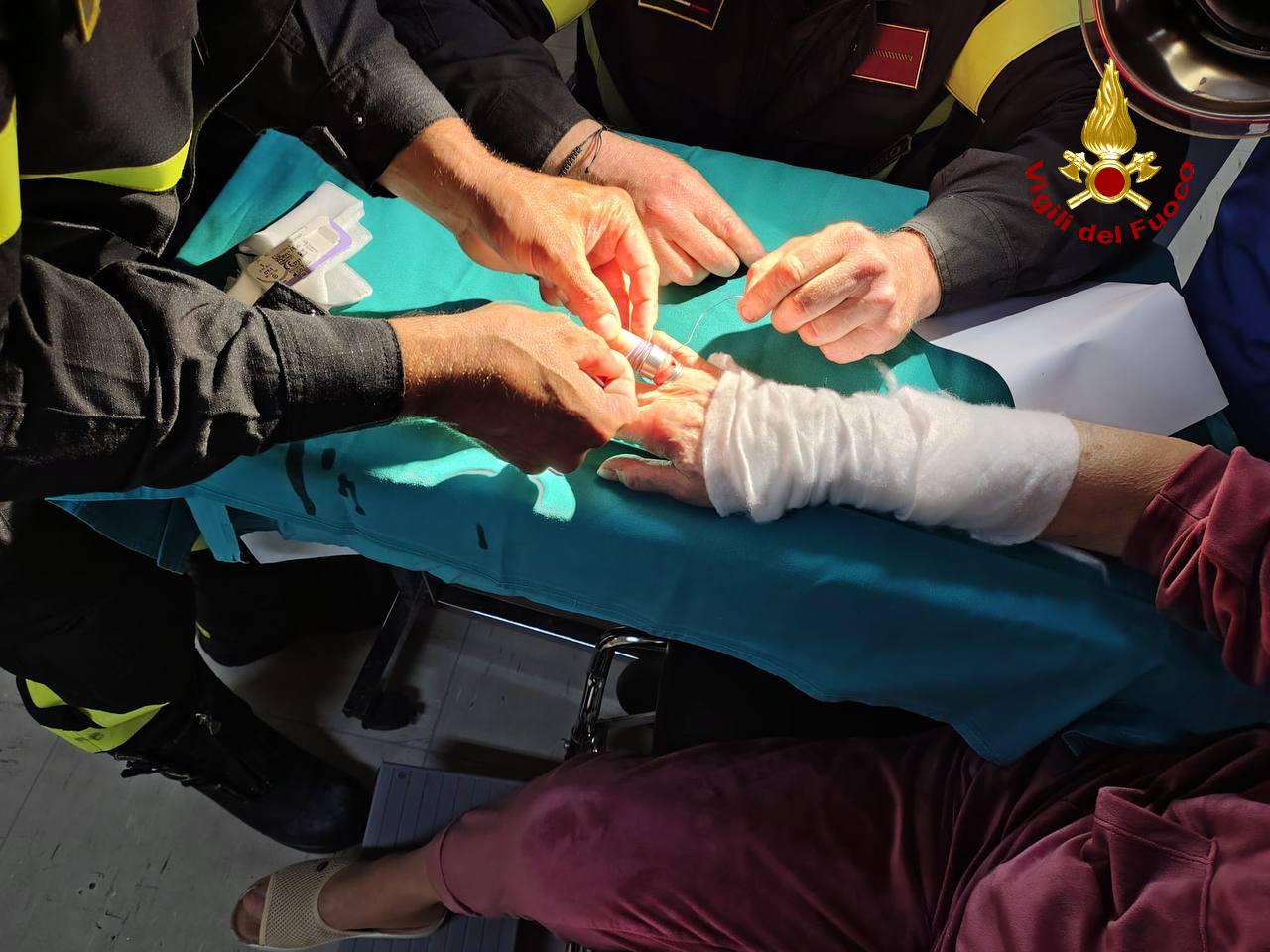 Poco prima delle 18 di ieri pomeriggio la Sala Operativa del 115 ha ricevuto una chiamata di supporto dal Pronto Soccorso dell’ Ospedale San Timoteo di Termoli, per estrarre due anelli dalla mano di un’anziana signora che per via di una precedente frattura aveva le dita particolarmente gonfie.