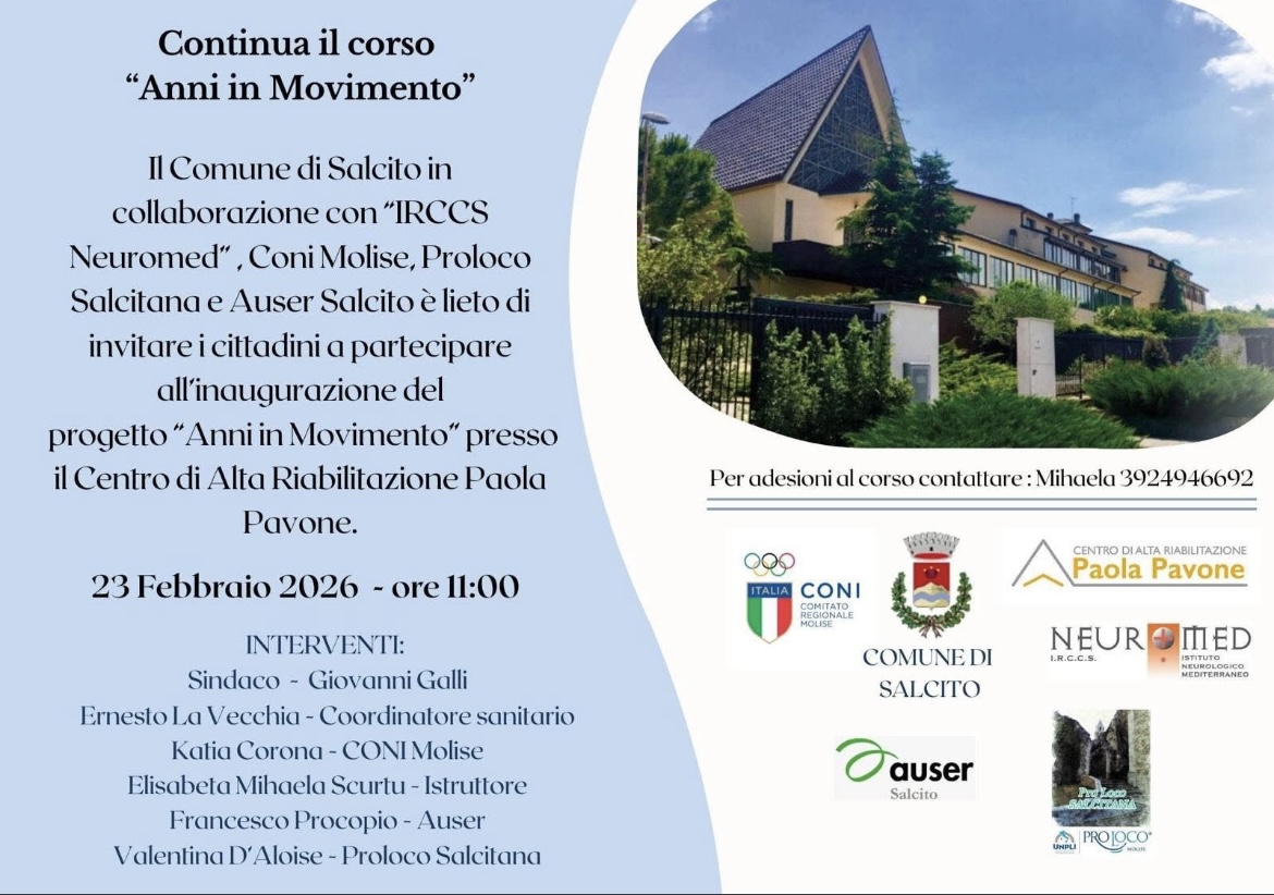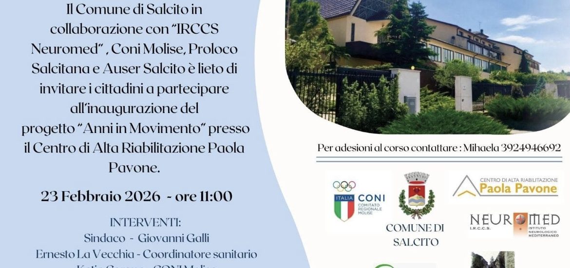 Lunedì 23 febbraio, alle ore 11, nel Centro di Alta Riabilitazione “Paola Pavone” di Salcito si terrà l’inaugurazione del progetto “Anni in movimento”. Promosso insieme al Comune di Salcito, il CONI Molise, l’Auser e Pro Loco Salcitana, questa iniziativa vuole promuovere un percorso di benessere, socialità e prevenzione dedicato agli anziani.