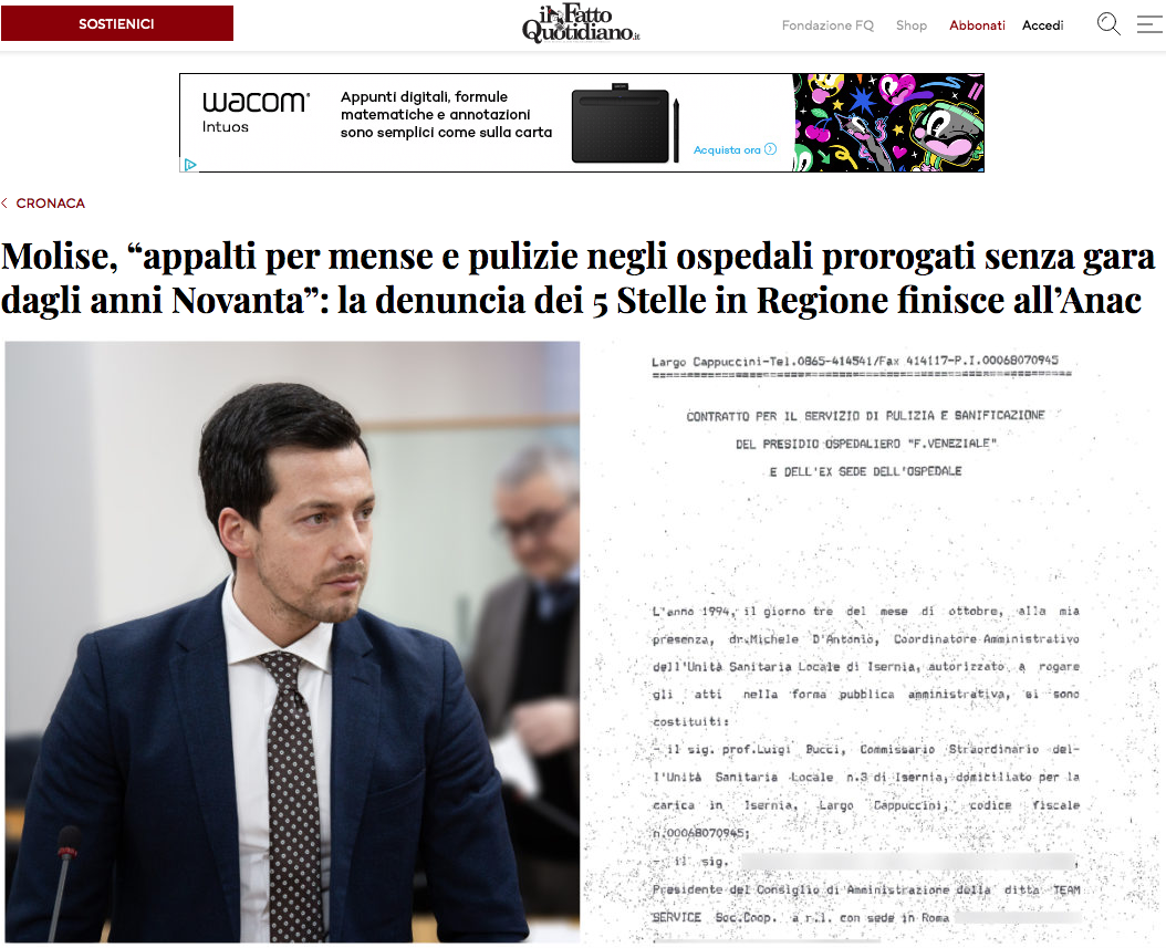 Il Fatto Quotidiano on line diretto da Peter Gomez, rilancia la denuncia di Andrea Greco, capogruppo del M5S in Consiglio regionale sugli appalti non sanitari risalenti agli anni ’90 negli ospedali del Molise. Questa mattina il portale del quotidiano ha pubblicato un dettagliato articolo dove Greco evidenzia quanto accade nelle strutture ospedaliere del Molise. Un focus che tira in ballo, tra l’altro, anche il ‘San Francesco Caracciolo di Agnone’. Di seguito il link dove poter leggere il pezzo integrale: