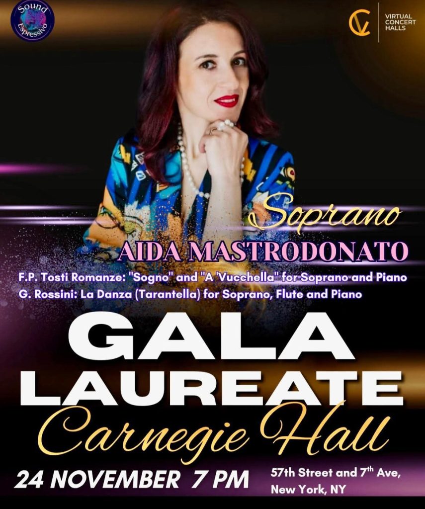 Aida Mastrodonato, soprano originaria di Bagnoli del Trigno (IS), docente di Canto, concertista e didatta nata a Campobasso, rappresenta una delle voci liriche più raffinate e riconosciute della scena regionale e nazionale. La sua formazione, maturata attraverso anni di studio, ricerca vocale, perfezionamento e una vasta esperienza in ambito concertistico e teatrale, l’ha portata a costruire un repertorio ampio e tecnicamente solido, capace di unire eleganza interpretativa e intensità emotiva. La sua esibizione alla Carnegie Hall ha messo in luce queste qualità, confermando la sua statura artistica davanti a un pubblico internazionale estremamente esigente.