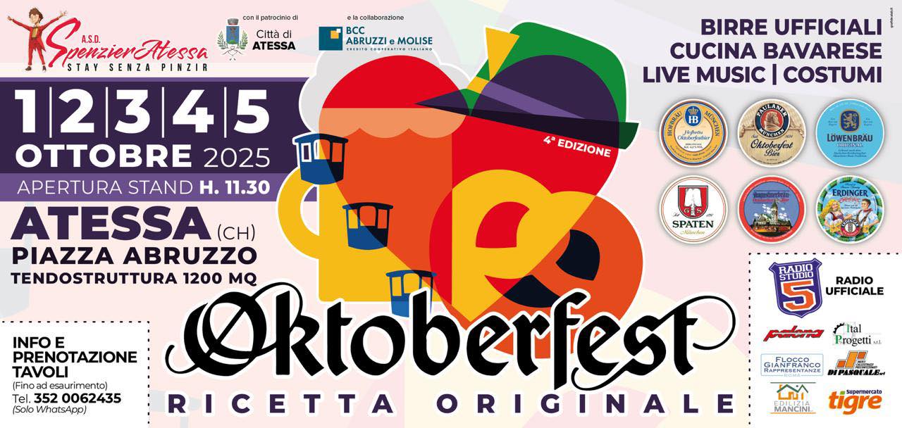 Cinque giorni per brindare, cantare e gustare insieme i sapori e i profumi della Baviera. Dal 1° al 5 ottobre prossimi, Piazza Abruzzo ad Atessa (Ch) diventerà il cuore pulsante di una festa che, anno dopo anno, è riuscita a conquistare migliaia di visitatori. L’Oktoberfest di Atessa, giunto alla quarta edizione, promette ancora una volta di offrire al pubblico un’esperienza capace di unire la tradizione tedesca con la calda ospitalità abruzzese.