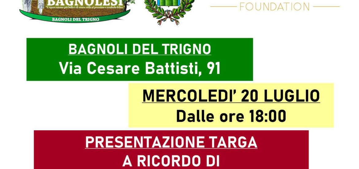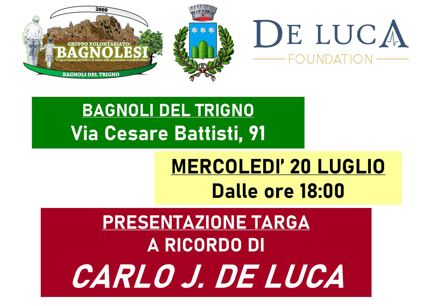 Mercoledì 20 luglio alle ore 18 si terrà a Bagnoli del Trigno la presentazione di una targa in ricordo del Dr. Carlo J. De Luca, ricercatore, ingegnere biomedico ed esperto di elettromiografia e biomeccanica. L’evento si terrà in Via C. Battisti, 91 davanti la casa in cui nacque nell’ottobre 1943.