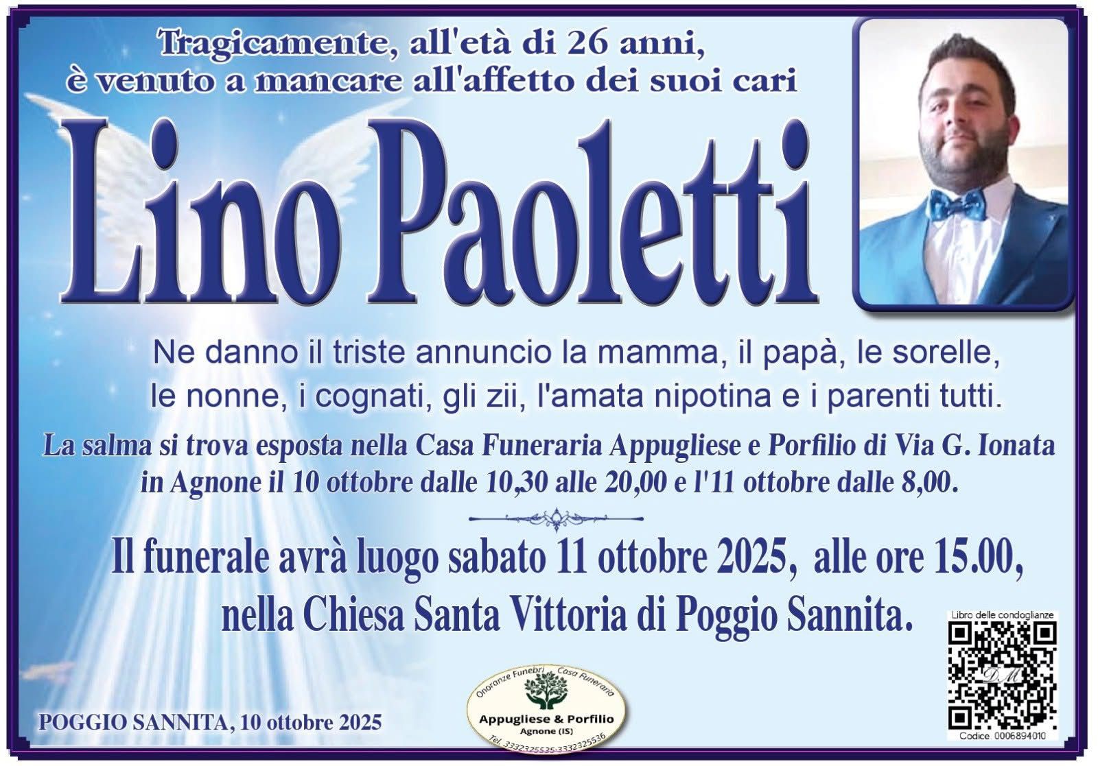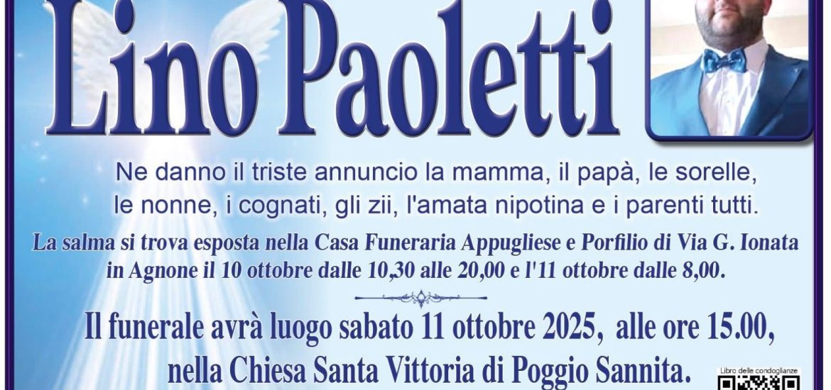 Per questi motivi il sindaco Orlando ha disposto il lutto cittadino nella giornata di celebrazione delle esequie, che si svolgeranno domani, sabato 11 ottobre, alle ore 15 presso la chiesa di Santa Vittoria in Poggio Sannita.