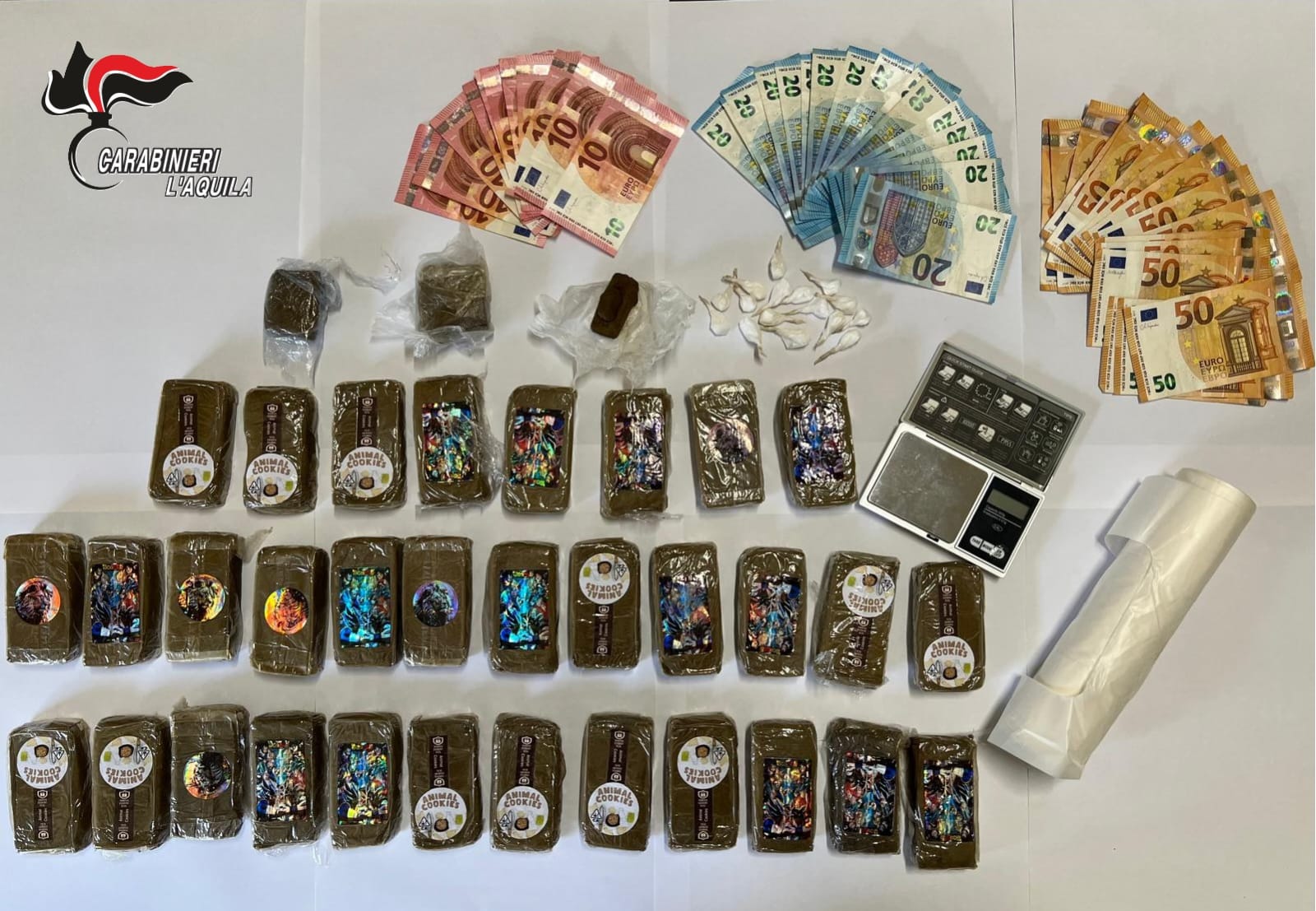 Dentro casa, ben occultati, gli operanti hanno scovato altri 3,2 Kg di hashish, confezionati in 32 “panetti” avvolti da cellophane trasparente e caratterizzati, ognuno, dalla presenza di immagini di animali o di cartoni animati, oltre ad una somma in denaro contante superiore a 1300 Euro