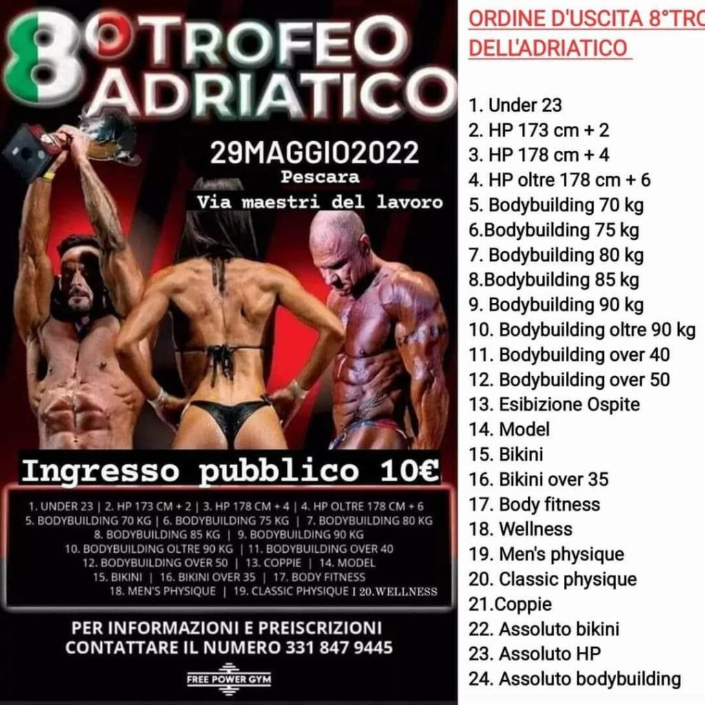 Dopo la lunga pandemia torna l’appuntamento con il body building a Pescara. Un appuntamento che mancava da troppo tempo nella città di Pescara e per gli appassionati del settore. La ASD Free Power Gym, storica dimora del culturismo abruzzese e della città di Pescara, torna in sella per organizzare la manifestazione denominata “Trofeo dell’Adriatico” che con quest’anno ha raggiunto l’ottava edizione. Tanti gli appassionati anche quest’anno, sia come atleti sa come pubblico pronti a sfidarsi a suon di muscoli. Tra gli ospiti, anche campioni del settore, che si esibiranno sul palco per deliziare il pubblico presente.