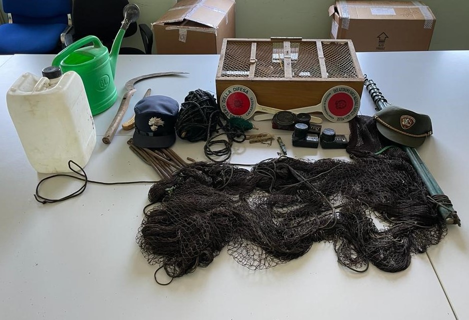 Montenero Val Cocchiara (IS) – Carabinieri forestali del Nucleo di Frosolone (IS) e del N.I.P.A.A.F. di Isernia unitamente ai Guardiaparco del Parco Nazionale d’Abruzzo, Lazio e Molise in località “Pantano – Zittola” hanno sorpreso due uomini di origini campane, non titolari di porto di fucile e privi di licenza di caccia, intenti a catturare cardellini con l’impiego di reti da uccellagione, con tre cardellini usati come richiami vivi legati tramite un filo al busto che impediva loro il volo e con quattro richiami acustici elettromagnetici.