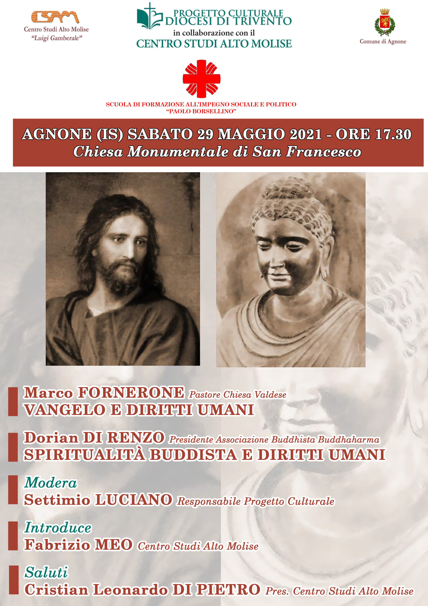 L’appuntamento è nella chiesa monumentale di San Francesco per sabato 29 maggio (ore 17,30). L’evento è organizzato in collaborazione con la diocesi di Trivento e la scuola di formazione politica ‘Paolo Borsellino’. All’incontro aperto al pubblico, interverrà Marco Fornerone, pastore della Chiesa Valdese che parlerà di ‘Vangelo e diritti umani’. A seguire Dorian Di Renzo, presidente dell’Associazione buddhista Buddhadharma che interverrà sul tema dal titolo: “Spriritualità buddista e diritti umani”.