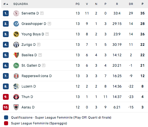 Il successo sullo Zurigo, a cinque giornate dal termine della regolar season, consente al Servette di rafforzare il primato in classifica: le ginevrine guidano la graduatoria con 35 punti, mantenendo un margine di sette lunghezze sulla più immediata inseguitrice, il Grasshopper, fermo a quota 28.