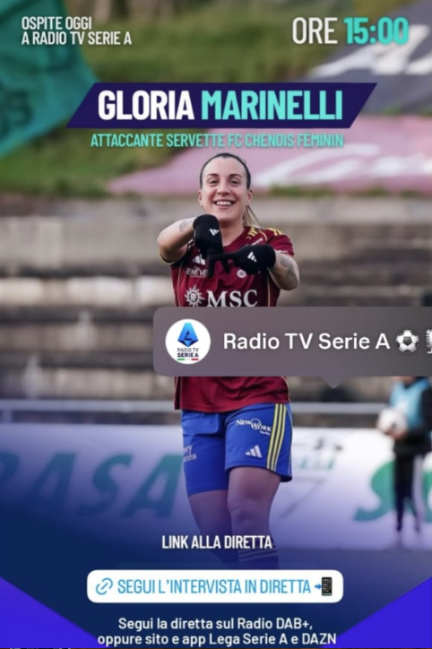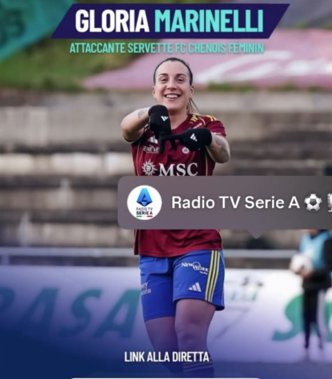 L’attaccante agnonese Gloria Marinelli sarà ospite questo pomeriggio (5 marzo) di Radio TV Serie A. L’appuntamento è fissato per le ore 15, quando la centravanti del Servette, capolista del massimo campionato femminile svizzero, sarà intervistata in studio dal giornalista Alessandro Rimi.