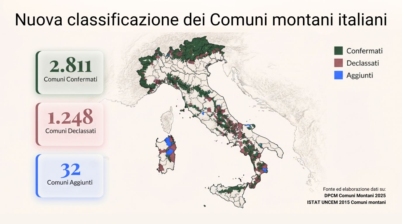Con la legge n. 131/2025, entrata in vigore lo scorso settembre, su iniziativa di Roberto Calderoli, ministro per gli Affari regionali e le Autonomie, è stata approvata una robusta sforbiciata all’Elenco portando i Comuni dagli attuali 4.058 a poco più di 2.800, grazie a nuovi criteri di classificazione. Restano in Elenco solo gli Enti con almeno il 25% di territorio sopra i 600 metri e una pendenza di almeno il 20%, oppure se la loro media altimetrica supera i 500m.