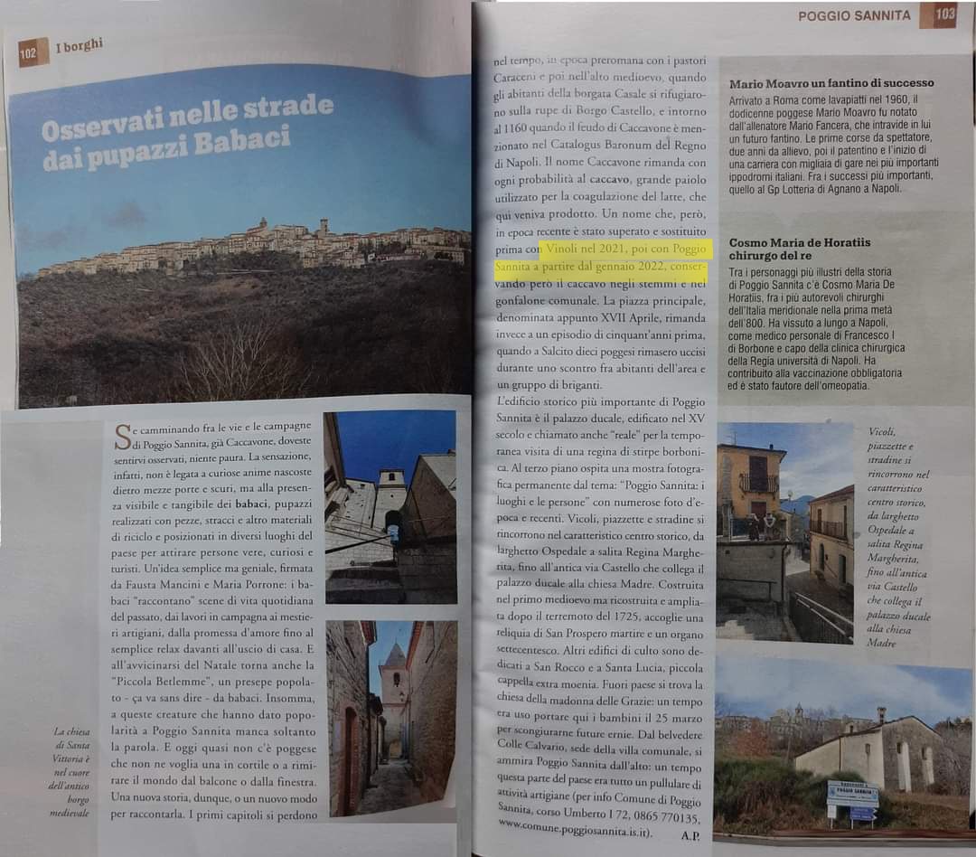 «La recente pubblicazione di una “Guida ai sapori e ai piaceri – Viaggio in Molise, alto e medio Sannio” , nelle due pagine dedicate a Poggio Sannita, tesse le lodi dei Babaci “idea semplice ma geniale, firmata da Fausta Mancini e Maria Porrone”. – inizia Palomba nella sua analisi – Tutti ci congratuliamo per il meritato successo dell’iniziativa, che ha dato visibilità al paese a livello nazionale e portato a Poggio frotte di turisti, suscitando l’interesse dei media, interesse suggellato anche dalla pubblicazione sulla guida di Repubblica che tratta l’argomento in maniera appropriata e puntuale. Bene anche il riferimento alla carriera e alle affermazioni sportive del fantino Mario Moavro, gloria poggese dell’ippica. Più in generale, però, – continua Palomba – nei testi riguardanti il paese e la sua storia, la guida non è stata altrettanto precisa. A cominciare da citazioni e riferimenti storici sbagliati: il cambio del nome del paese in Vinoli 1921 e Poggio Sannita 1922, anziché come riportato 2021 e 2022 (anni del centenario) ed il conseguente errato riferimento temporale ai fatti del 17 Aprile 1862 (e non una cinquantina di anni prima rispetto al 2021/22)». Alla fine hanno sbagliato solo di un secolo, ci può stare; un po’ meno considerando che il breve testo è costato alle casse comunali di Poggio ben cinquecento euro.