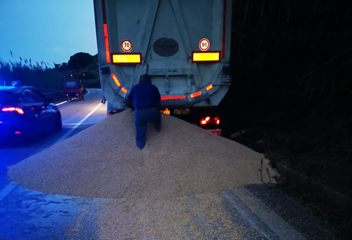 Sulla statale Adriatica, tra Fossacesia e Rocca San Giovanni, nella serata di oggi, un autoarticolato proveniente dal porto di Ortona ha perso il carico di mais a causa del malfunzionamento di una sponda. Il materiale ha invaso completamente la sede stradale.