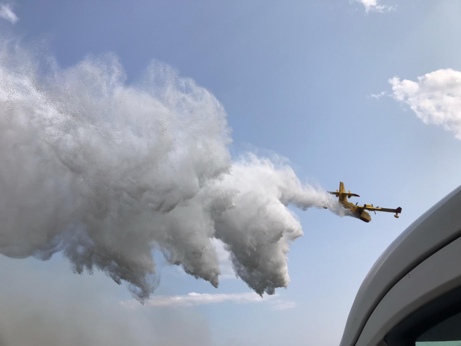 Un fronte a monte della ex statale Istonia, tenuto a bada dalle squadre di Protezione civile di Carunchio e Castiglione Messer Marino, e uno a valle, ben più preoccupante vista la presenza in zona di abitazioni e insediamenti. E’ lo scenario attuale dell’emergenza incendio che sta interessando una vasta area al confine tra Castiglione Messer Marino e Belmonte del Sannio. Le squadre di Vigili del fuoco del distaccamento di Agnone, i primi ad intervenire, sono schierate a protezione delle abitazioni e delle stalle, mentre il canadair appena dirottato in zona dall’altro incendio, quello di Atessa, ha appena effettuato i primi lanci di acqua e schiuma ritardante. Il “Can 26” si rifornisce presso l’invaso artificiale di Bomba. Undici minuti appena tra un lancio e l’altro, per effettuare il rifornimento e scaricare sulle fiamme ben seimila litri di liquido in un colpo solo.