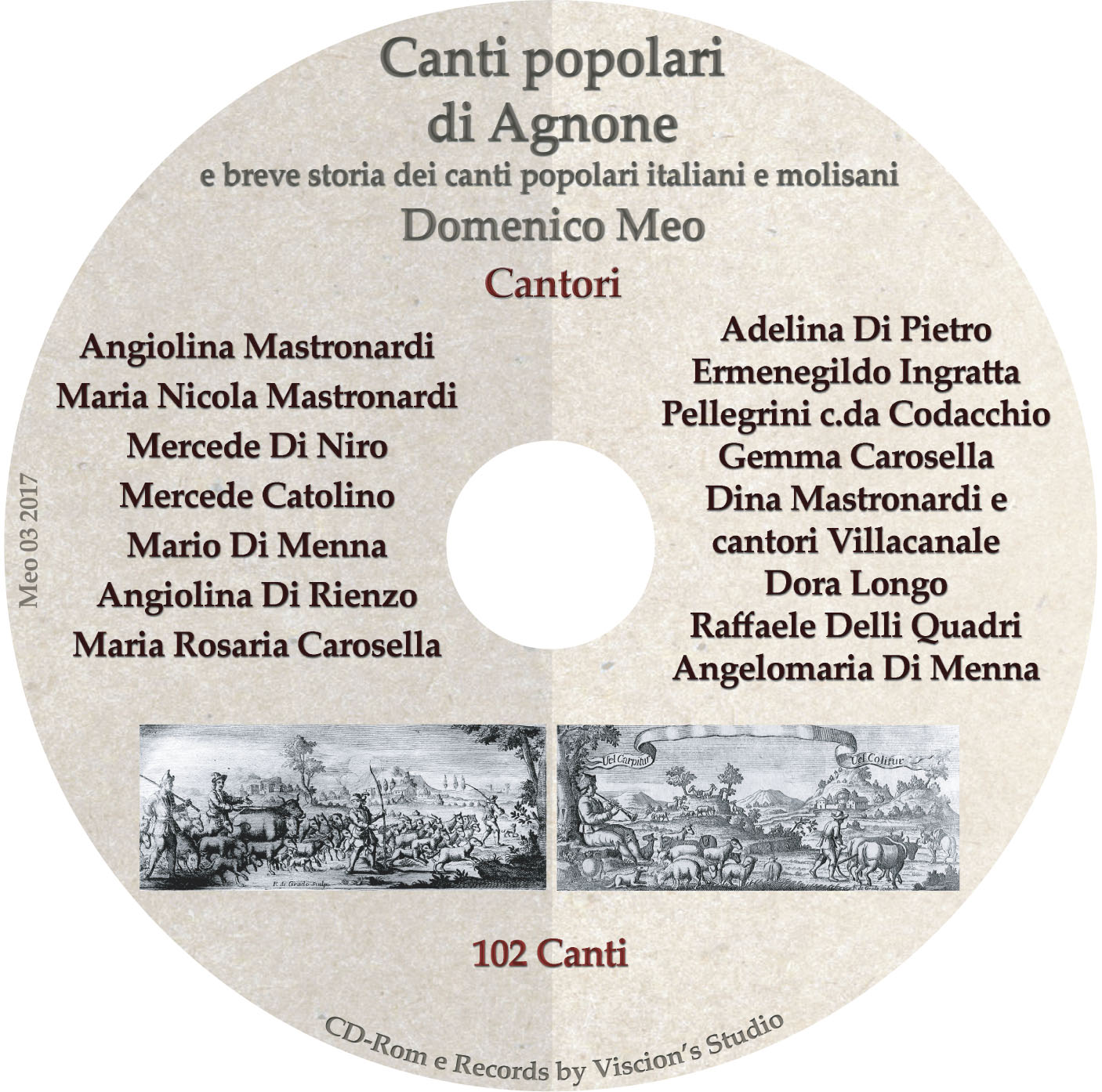 Per quanto concerne gli studi di interesse etnomusicologico, Meo, dà conto delle attività del Centro nazionale di studi di musica popolare e delle ricerche condotte dai maggiori protagonisti degli studi del secondo dopoguerra, in primo luogo di D. Carpitella e R. Leydi, fino alle più recenti attività di ricognizione etnomusicologica. Nella sezione dedicata a Il canto popolare in Molise è giustamente messo in evidenza il fondamentale lavoro di ricerca di Eugenio e Alberto Cirese che rappresenta uno dei ponti fra gli studi locali e quelli nazionali. La terza parte, di più calzante pertinenza agli interessi agnonesi, ripropone i testi pubblicati da Casetti e Imbriani (1871-1872), quelli inseriti nella monografia di O. Ciani del 1888, fino alle pubblicazioni di G. Cremonese, comparse fra il 1889 e il 1892 e all’articolo di Michele Di Ciero sulla rivista “Lares” nel 1970. La ricostruzione storica diventa autobiografica quando le esperienze di Meo si legano alla fondazione del Gruppo Folklorico Rintocco Molisano e all’appassionante raccolta delle espressioni di poesia cantata agnonese. A partire dal 1988, infatti, conduce in prima persona la ricerca, documentando non solo la componente testuale, ma – colmando una lacuna fino ad allora presente – avvia anche la registrazione sonora delle musiche tradizionali cantate, oltre a recuperare alcuni documenti sonori storici di molti anni precedenti.