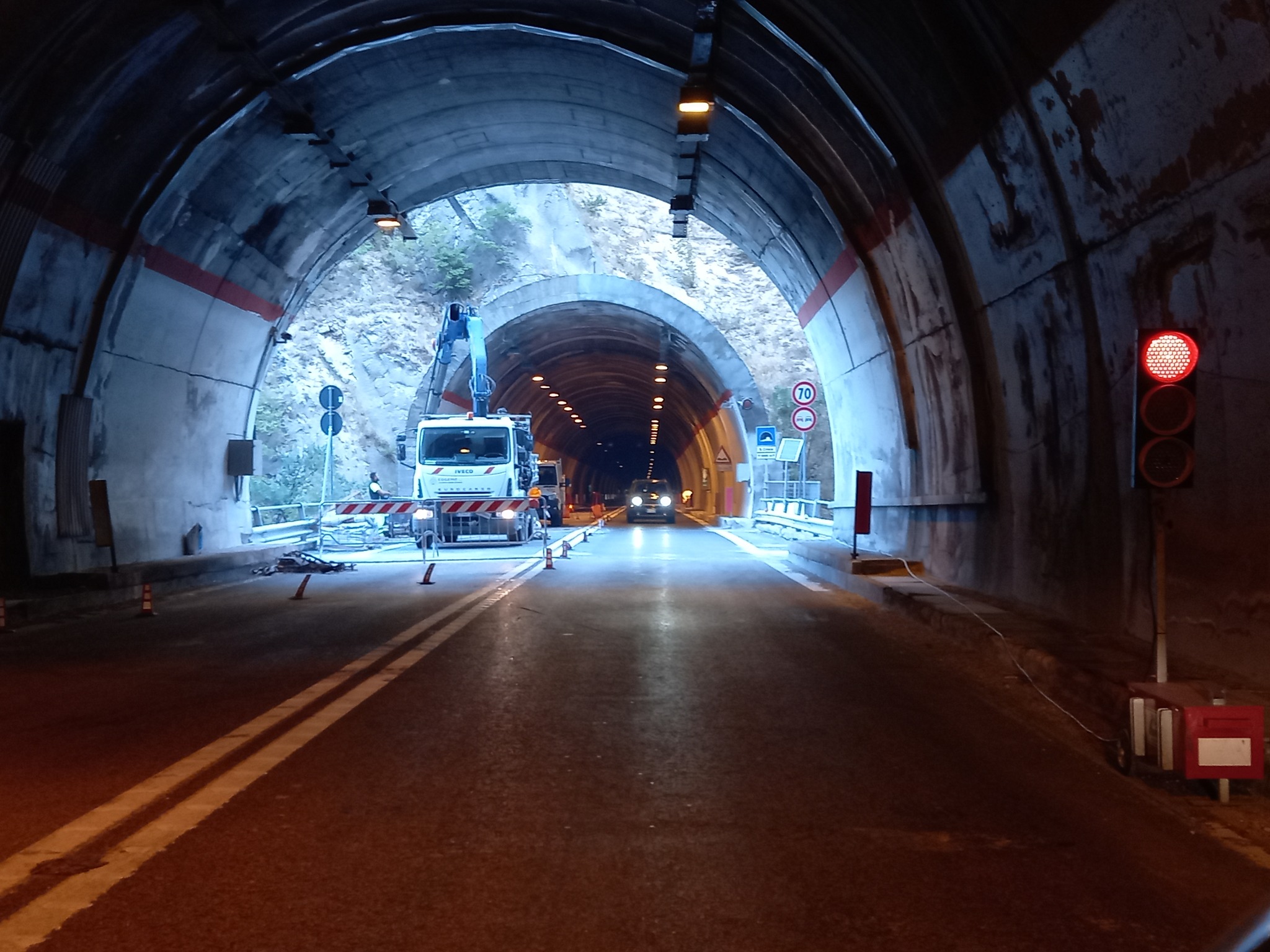 Semafori nei due sensi di marcia per alternare il passaggio dei veicoli lungo il tratto di strada della Trignina interessato dai lavori della galleria “Serre”.
