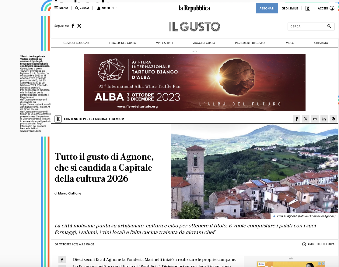 Capitale italiana della Cultura 2026, la sezione ‘Gusto’ de la Repubblica online dedica un ampio servizio ad Agnone. L’articolo a firma del giornalista Marco Ciaffone – che rilanciamo integralmente su l’Eco – è un viaggio nell’enogastronomia del territorio, distretto di caseifici, leader nella produzione di dolci, salumi e vini trainatida giovani chef, molti dei quali “sfornati” dall’istituto Alberghiero ‘San Francesco Caracciolo’. Non c’è che dire: un bellissimo biglietto da visita in attesa che Roma decida – nel mese di dicembre – le dieci finaliste che a fine marzo 2024 si contenderanno il titolo finale.