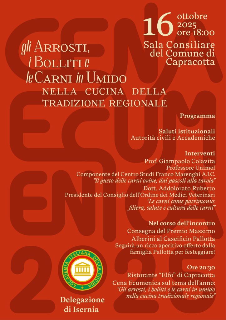 Nella maestosa cornice dell’Alto Molise, la Delegazione di Isernia dell’Accademia Italiana della Cucina invita tutti gli Accademici e gli amanti della cultura gastronomica a un appuntamento di alto valore culturale dedicato al tema dell’anno: “Gli arrosti, i bolliti e le carni in umido nella cucina della tradizione regionale”.