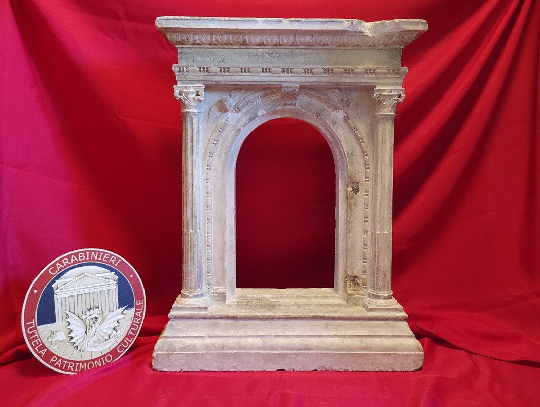 I militari che già da tempo monitoravano il “mercato illecito di beni culturali”, avevano individuato e identificato un aquilano sospettato di essere coinvolto nella vicenda. La perquisizione concordata con l’Autorità Giudiziaria eseguita presso la sua abitazione, permetteva di rinvenire e recuperare il tabernacolo. Un bene di particolare pregio e finemente rifinito, ancora in ottimo stato di conservazione, costituito da due colonnine scanalate con capitelli compositi i quali sorreggono un’architrave modanata, con una cornice baccellata che descrive un arco a tutto sesto, e decorato infine con due teste di putti alati.
