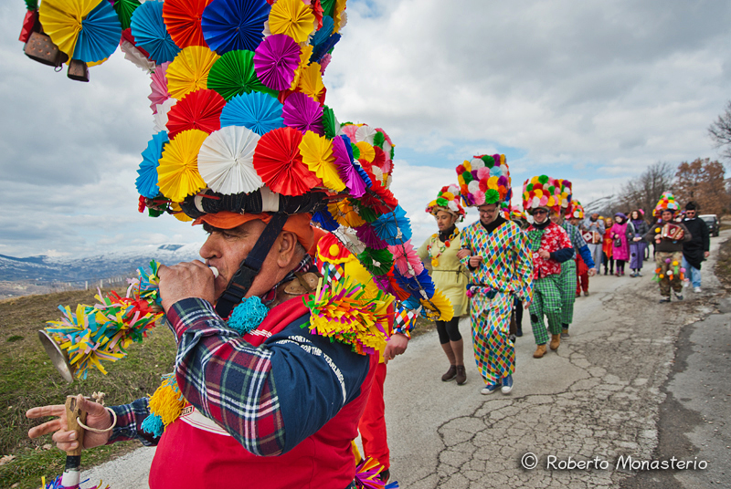Grande festa di carnevale a Schiavi di Abruzzo. Questo paese ricco di storia, cultura e tradizioni, ogni anno a carnevale propone un’antica festa con “I Mazzaroni” (l’mazzaroun in dialetto locale). I Mazzaroni sono i giovani del paese, che indossano un caratteristico copricapo, il Cimiero (C’mir) di varie forme, ricoperto di colorati fiori di carta e nastri (zagarelle).