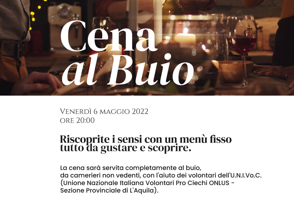 «Si tratta di un evento in collaborazione con l’U.Ni.Vo.C. sezione de L’Aquila. – spiegano gli organizzatori – Gli invitati dovranno mettersi per qualche ora nei panni di persone non vendenti, con l’unico scopo di sensibilizzare le persone a questa disabilità. Utilizzare gli altri sensi e cercare di stare al buio, al tavolo con persone con si conoscono e provare a capire quanto possa essere difficile ambientarsi e coordinarsi senza la vista. Un dono dato troppo spesso per scontato».