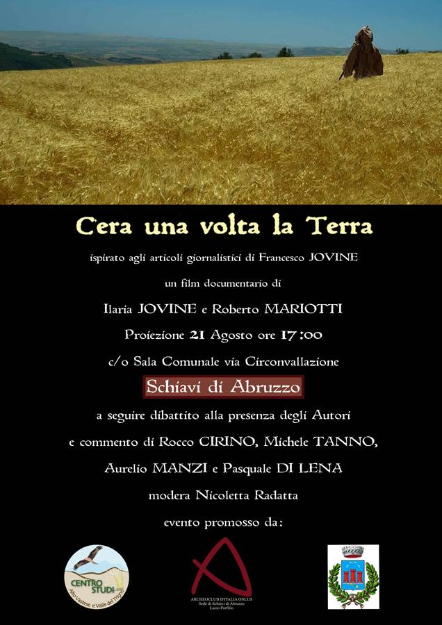 SCHIAVI DI ABRUZZO – Martedì 21 agosto alle ore 17 a Schiavi di Abruzzo ci sarà la proiezione del documentario C’era una volta la terra, diretto da Roberto Mariotti e Ilaria Jovine, nipote del famoso scrittore molisano Francesco Jovine.