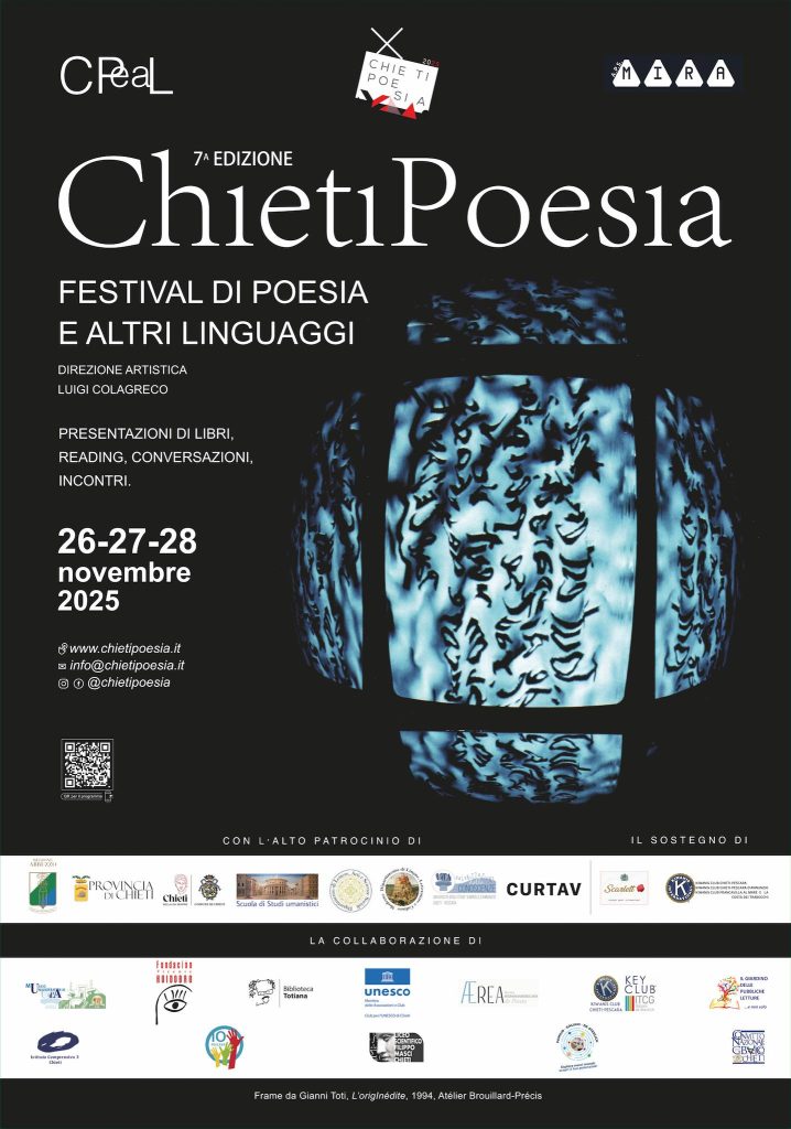 La settima edizione di ChietiPoesia – Festival di Poesia e altri Linguaggi si appresta ad aprire i battenti, proponendo un intenso programma che si svolgerà dal 26 al 28 novembre. La direzione artistica della manifestazione è curata da Luigi Colagreco, Direttore del Centro di Poesia e altri Linguaggi. L’evento coinvolgerà diverse sedi tra il Campus Universitario di Chieti e Pescara, scuole cittadine e associazioni culturali.